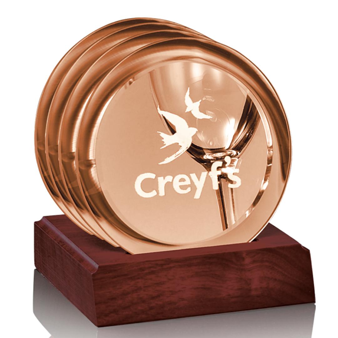 Beautifully structured set of 4 mirrored beveled coasters complete with a custom wooden base that is available in various colors to showcase the perfect presentation set. Plate on base optional. 4.0″ H