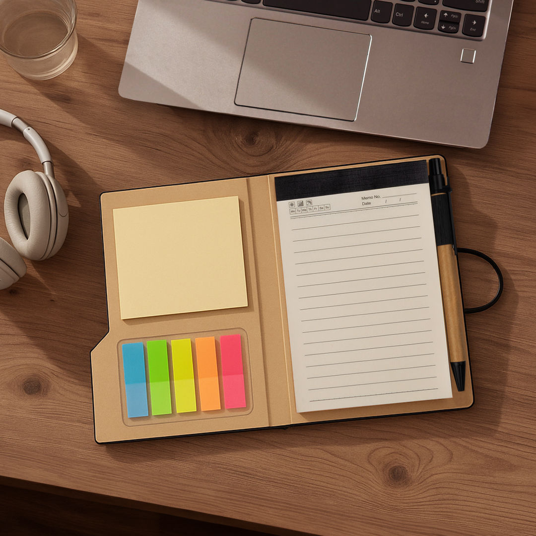 The Ashfall Journal with Sticky Notes & Pen is a versatile organizer designed for everyday productivity. It features a leatherette front cover for a sleek, professional look and a durable greyboard interior for added structure and sustainability. Inside, you’ll find a lined memo pad, large sticky notes, and colorful sticky tabs for quick reminders and organization. A pen loop with an included pen ensures you’re always ready to write, while the elastic closure keeps everything neatly secured. Perfect for meetings, travel, or desk use, this journal combines practicality with refined style.Product Size: 4″ W x 6″ H x 0.5″ D. 4.0″ W x 6.0″ H x 0.5″ D