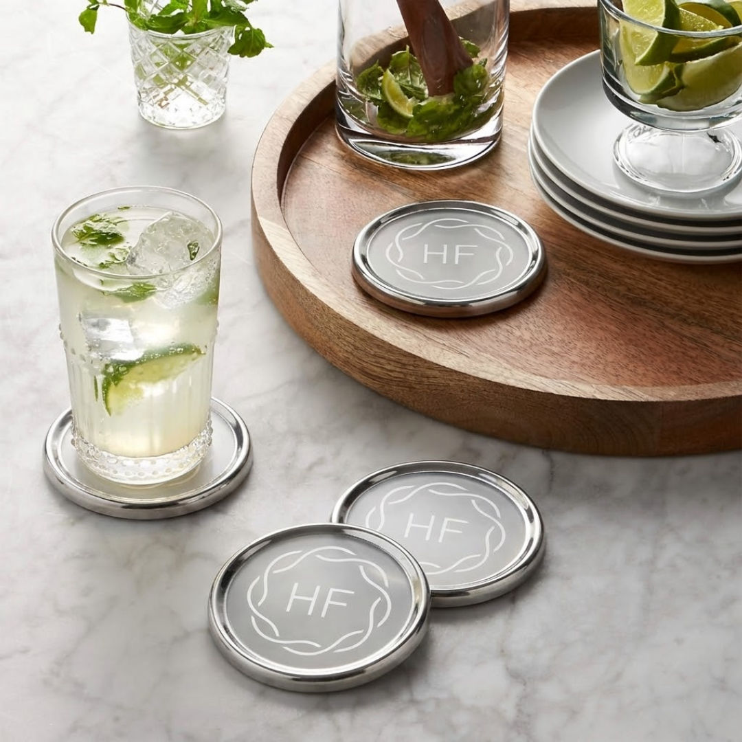The Baldoni Coasters Set of 4 delivers timeless elegance and everyday functionality. Made from premium stainless steel with a polished finish, these coasters protect surfaces from moisture while adding a refined, contemporary touch to any setting. Perfect for entertaining or corporate gifting, the set combines durability, style, and sophistication in a minimalist design. 3.5″ W x 0.375″ H x 3.5″ D