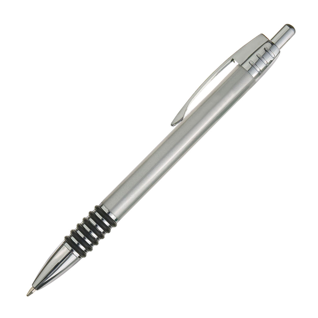Aluminum click-action ballpoint pen with chrome trim and real rubber comfort grip.