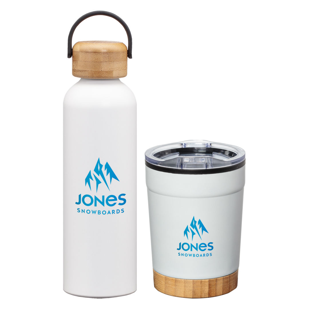The beautiful Bambus bottle and tumbler gift set includes our Bamboo twist-lid Greenstone bottle and matching Eduardo tumbler with a bamboo base. This a great gift idea for any occasion and a wonderful way to promote your brand or message.