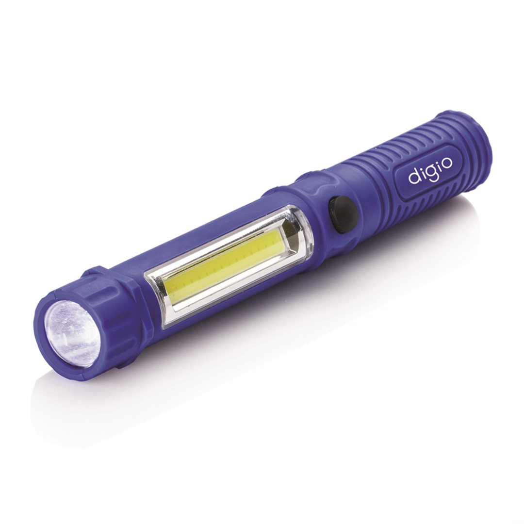 Rubberized ABS LED work light with magnetic base-LED flashlight and ultra bright COB light-ABS utility clip on back-3xAAA batteries (included)Product Size: 0.9375″ x 6.4375″. 0.9375″ W x 6.4375″ H