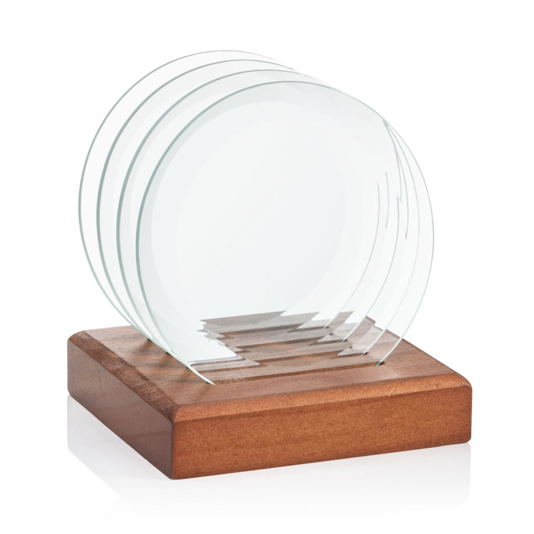 Four circular Bellevue jade glass coasters with wide, gradual bevels on the top surface, set into a slotted wood stand. Includes identical etching (on the underside) of all four coasters. 4.0″ H