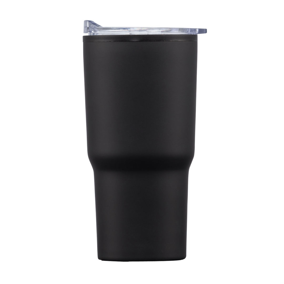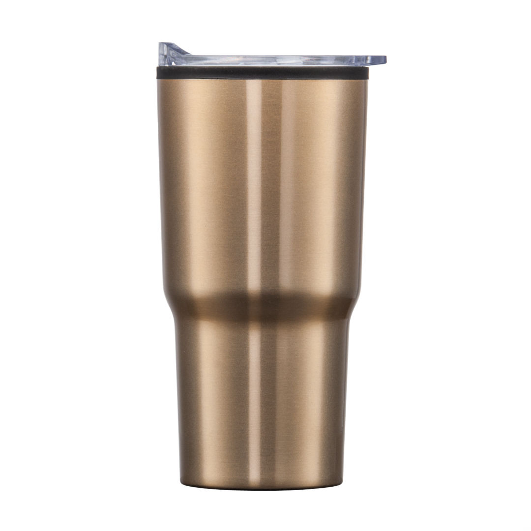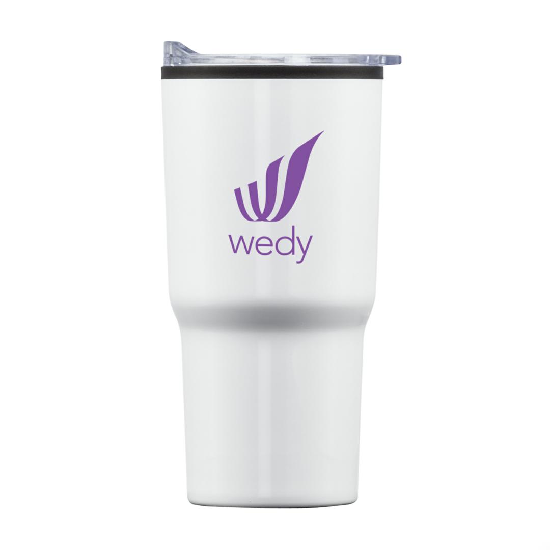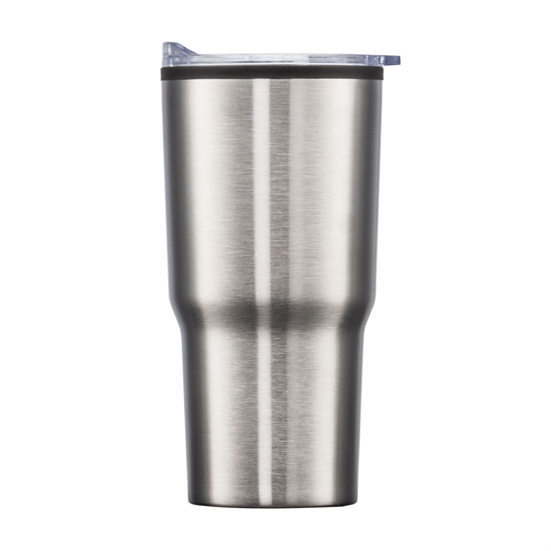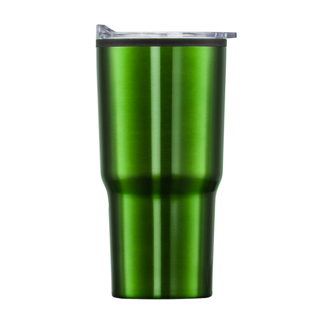 Stainless steel travel tumbler with thermoplastic liner- Double wall body with clear acrylic push-on lid- Extra-secure lid seal with easy thumb-slide sip opening – Scratch-resistant cushioned base – Designed for optimum fit in standard car cup holders. 3.75″ W x 7.0″ H