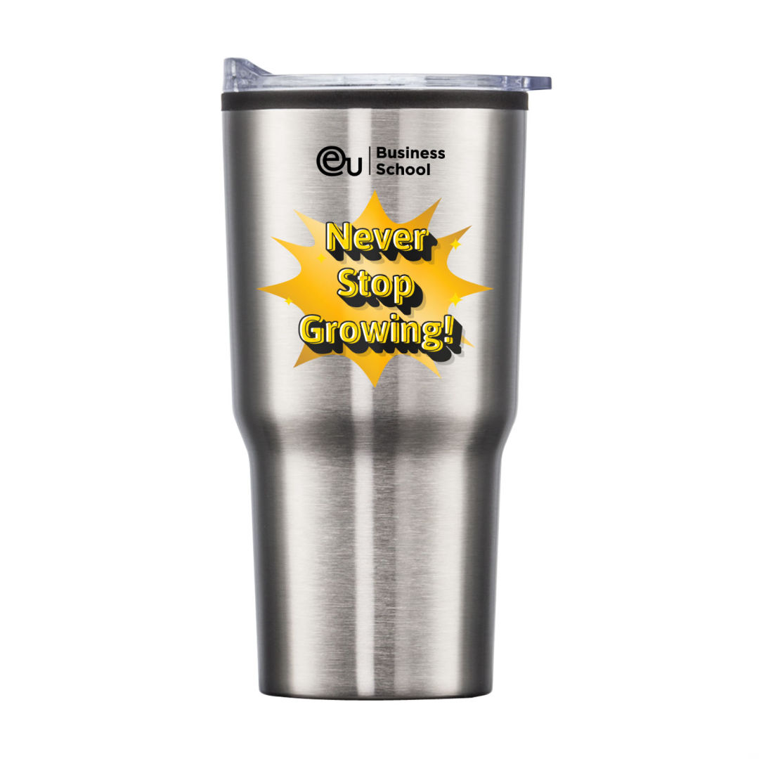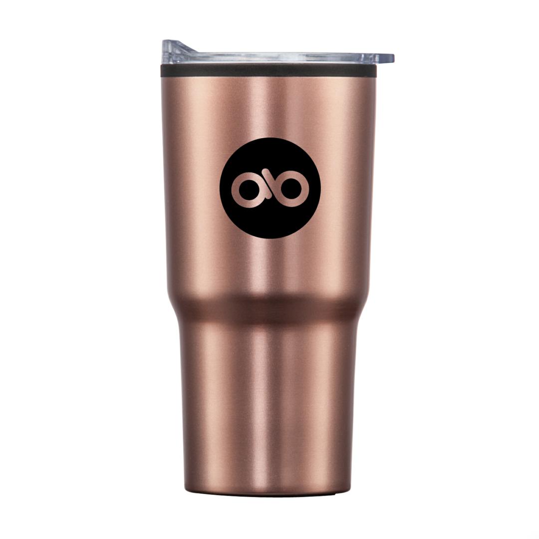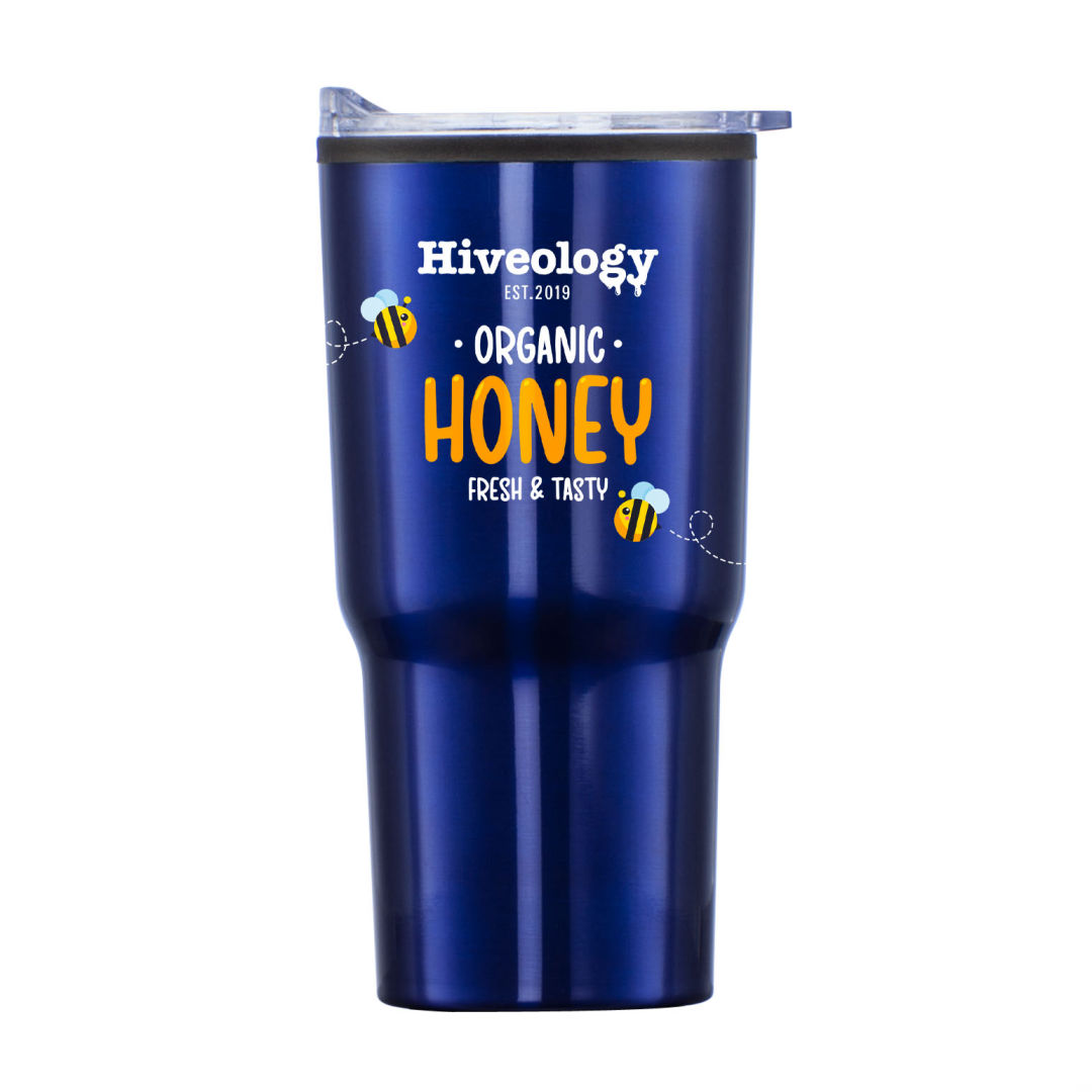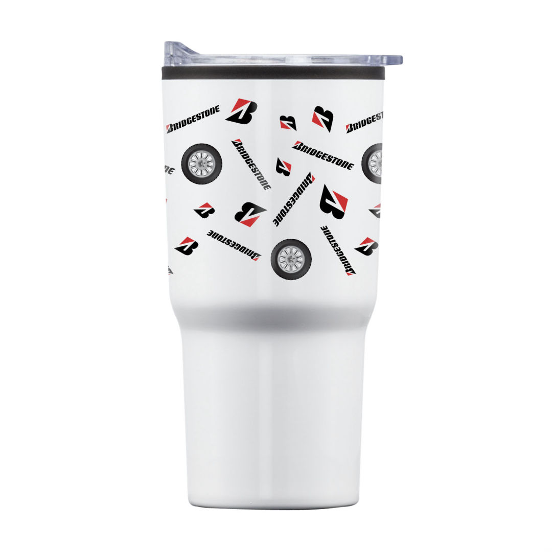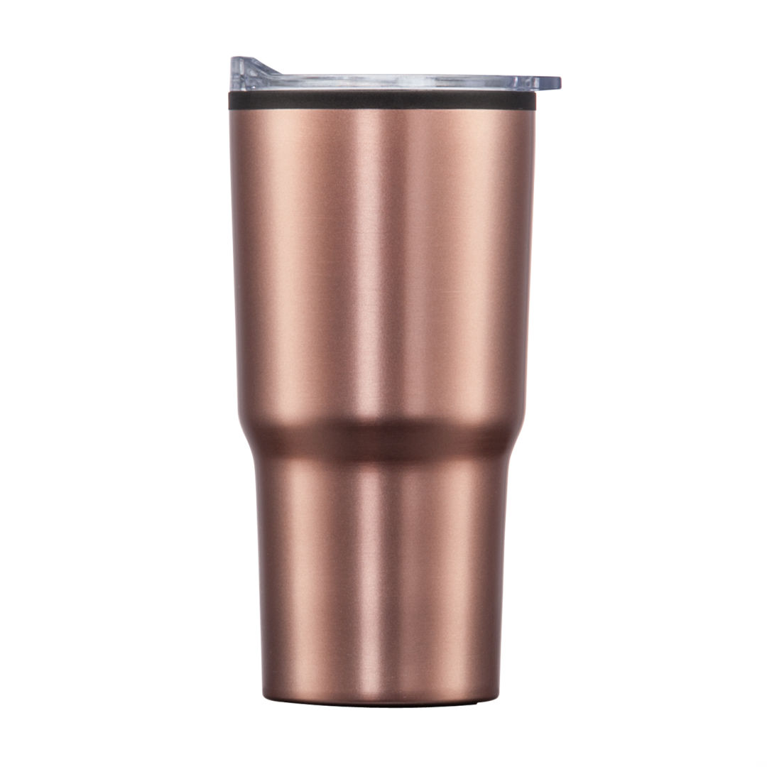 Stainless steel travel tumbler with thermoplastic liner- Double wall body with clear acrylic push-on lid- Extra-secure lid seal with easy thumb-slide sip opening – Scratch-resistant cushioned base – Designed for optimum fit in standard car cup holders. 3.75″ W x 7.0″ H
