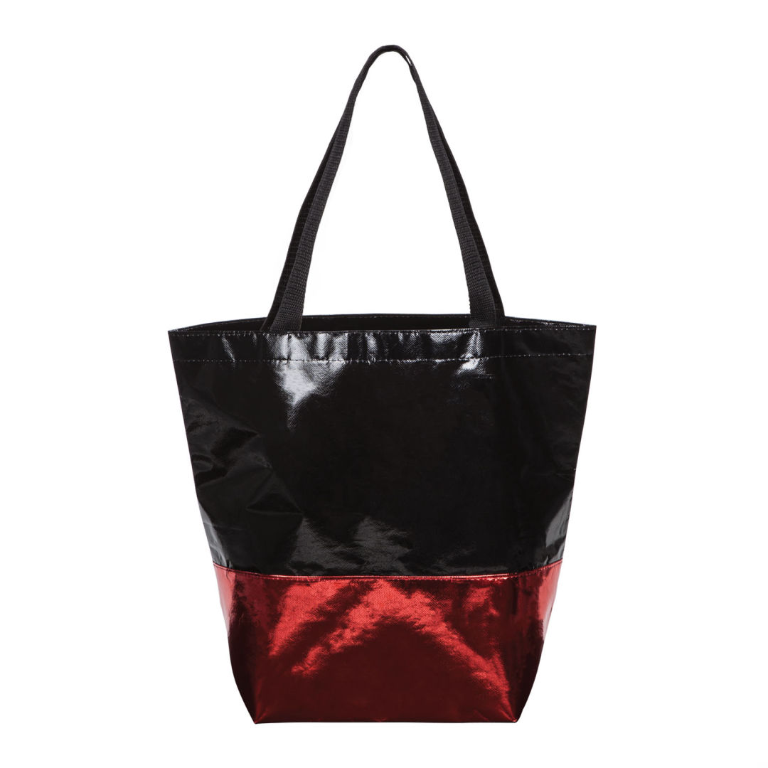 Two-toned non-woven PP tote bag with metallic finish- Fashion-forward, bold design that makes an impression- Lightweight design won’t weigh you down!- Foldable for convenient storageProduct Size: 17″ x 14″ x 7.5″. 17.0″ W x 14.0″ H x 7.5″ D