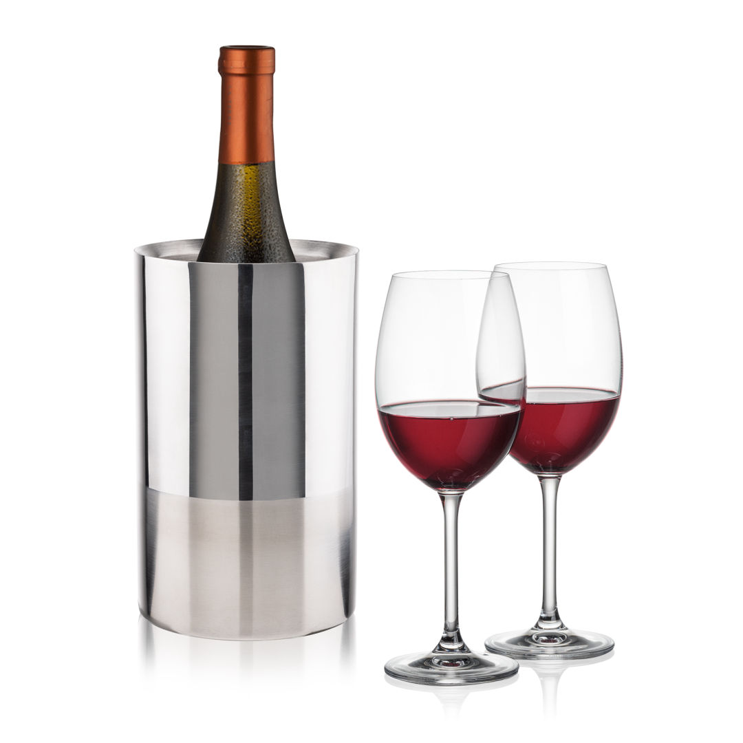 Elevate any pour with the Catania Wine Cooler & Wine Set, featuring a sleek, polished stainless steel cooler that keeps your favorite bottle perfectly chilled alongside elegant wine glasses for a refined table moment. The cooler’s modern silhouette delivers standout style from countertop to patio, while the crystal-clear glasses balance comfort and sophistication for reds, whites, or rosés. Available with a variety of stemmed and stemless wine glass options, this set makes an effortlessly versatile gift—or a timeless upgrade to your own barware.