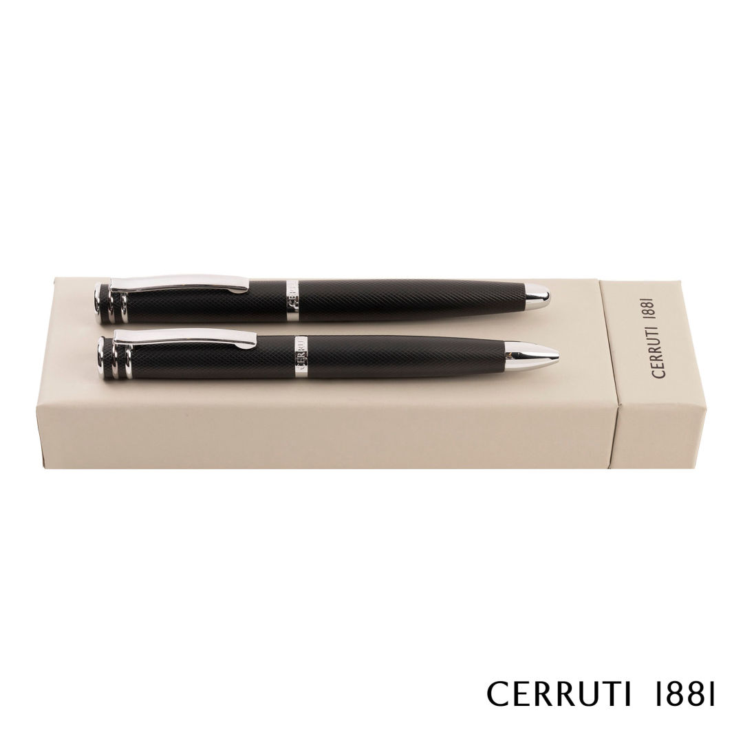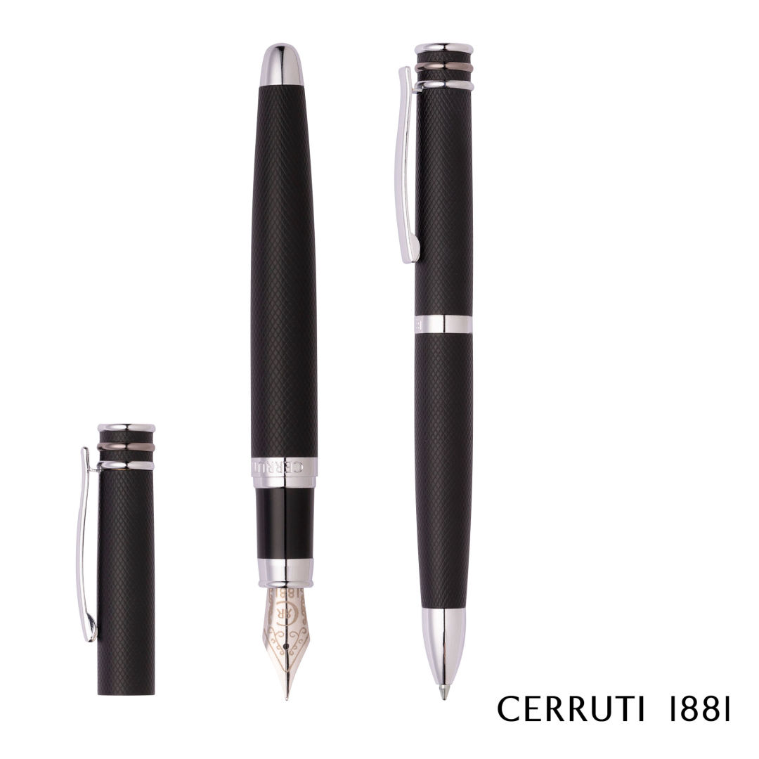 The Austin Diamond Black Pen Set from Cerruti features the iconic “Austin” ring top silhouette with a modern twist, showcasing a diamond-cut engraved surface. This sophisticated set includes a ballpoint pen and a fountain pen, both adorned with trendy yet understated bicolor gunmetal and chrome trims for a polished, contemporary look.Giftbox Size: 7.87″ W x 1.15″ H x 2.25″ D. 7.87″ W x 1.15″ H x 2.25″ D