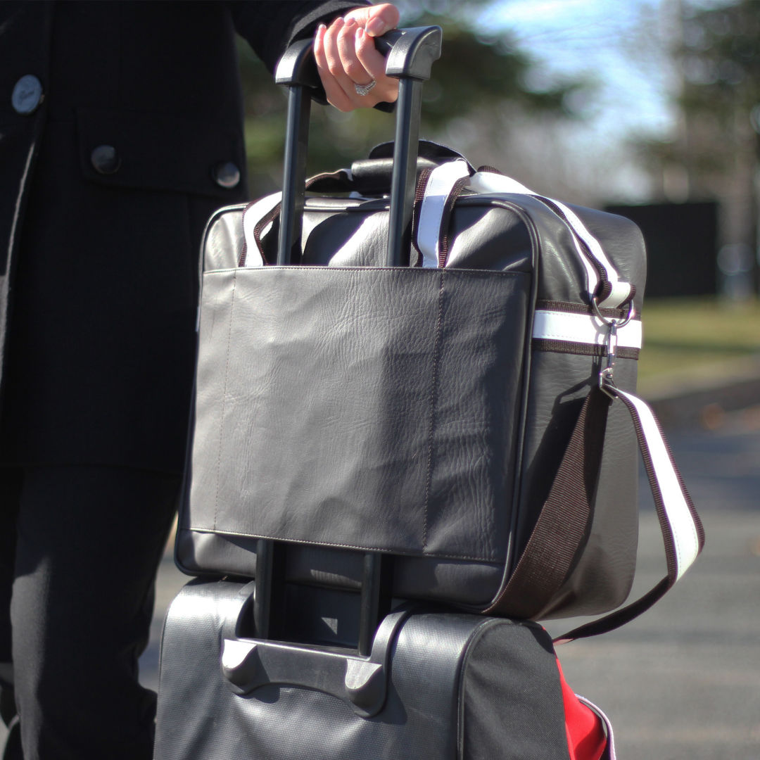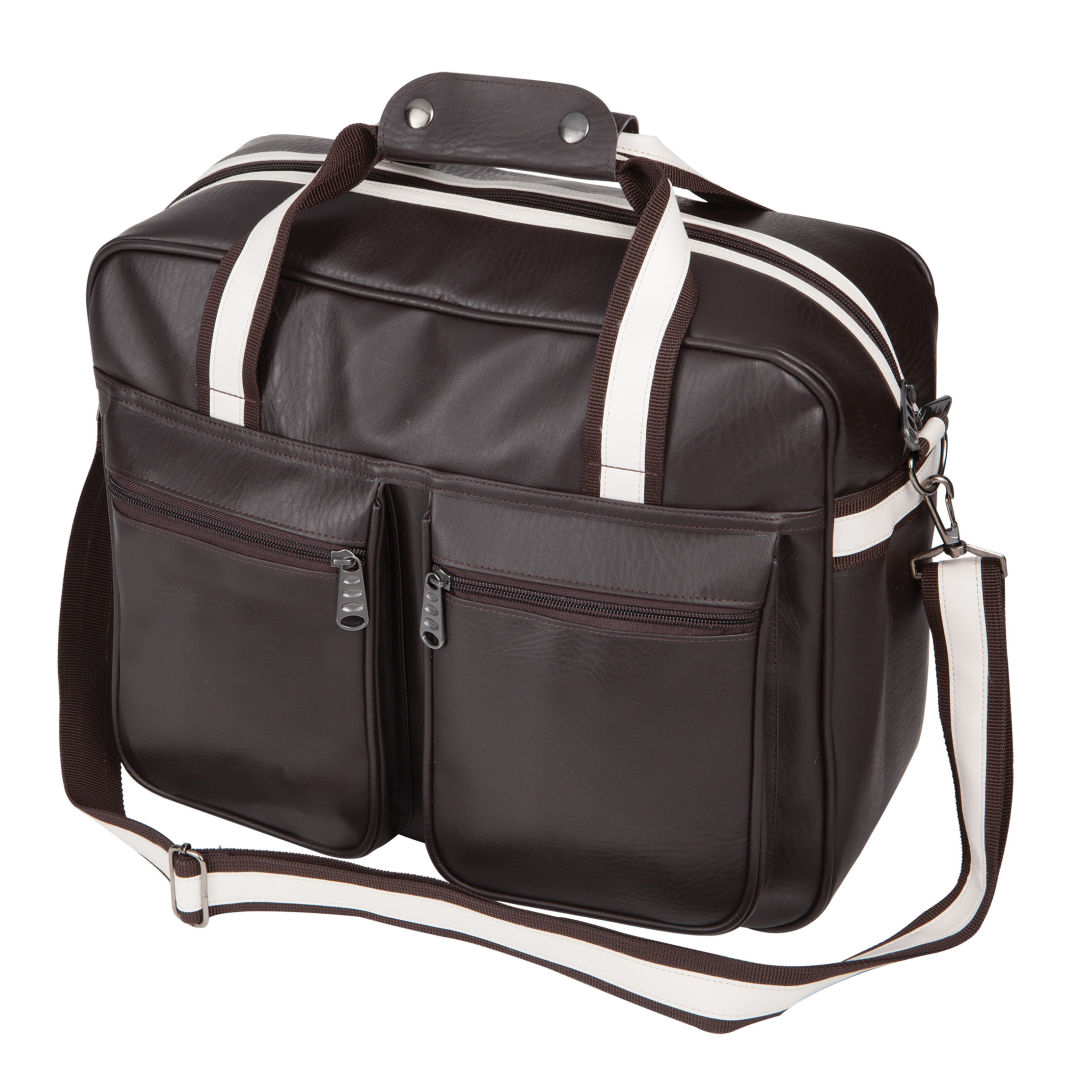 Textured PU bag with colour contrast accents- Large zippered main compartment- Padded laptop sectional – Holds laptops up to 13 inches- Fits over handles of travel luggage- Zippered dual front pockets- Extra durable handles- Adjustable and detachable shoulder strapProduct Size: 15.5″ x 13″ x 7.5″. 15.5″ W x 13.0″ H x 7.5″ D