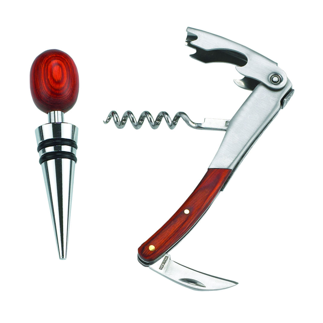 Stainless steel wine steward set-Chrome plated wine stopper, bottle opener, corkscrew and foil cutter-Rosewood handle. 3.75″ W x 5.5″ H x 1.25″ D