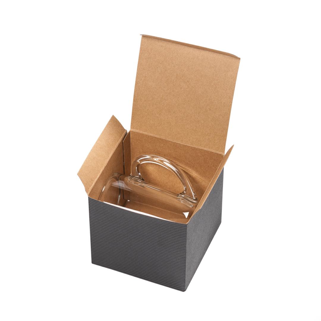 The Dundas glass mug is tall and narrow, perfect for a double espresso. The graceful handle completes the design with symmetrical style. 3.5″ W x 5.75″ H