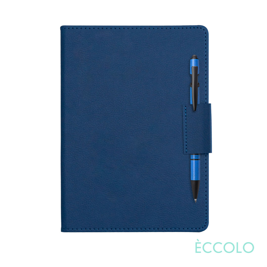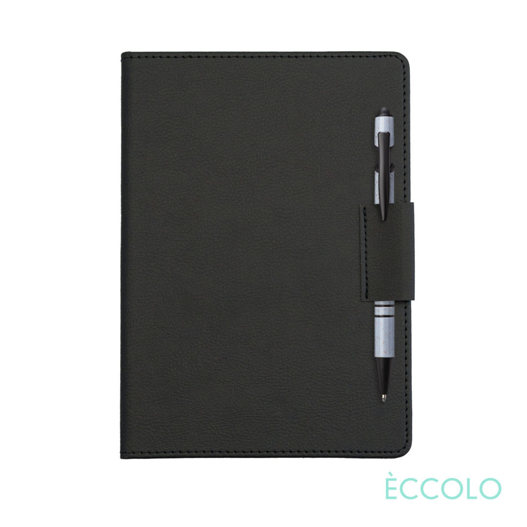 Uptown smart looking journal with material pen loop on cover. Be a stylish boss! The Eccolo® Carlton Journal & Austen Pen Set features…- P2372 Austen Pen: Click action ballpoint pen made from Eco-friendly composite wheat straw material with a stylus clicker.- Round corners with stitched edging- Hard non padded cover- 192 White lined pages- Acid-Free 80-gram paper- Pen holder on Cover- Rounded corners and stitched edging- 2 Bookmark ribbons (color matched)- Cool gray end pages- Undated and perforated calendar pages in the back (12-Month Spreads). – Journal size: 5.75″ x 8.25″*Belly Band & Promo Page Inserts Optional. See Decorating Info for details. 5.75″ W x 8.25″ H