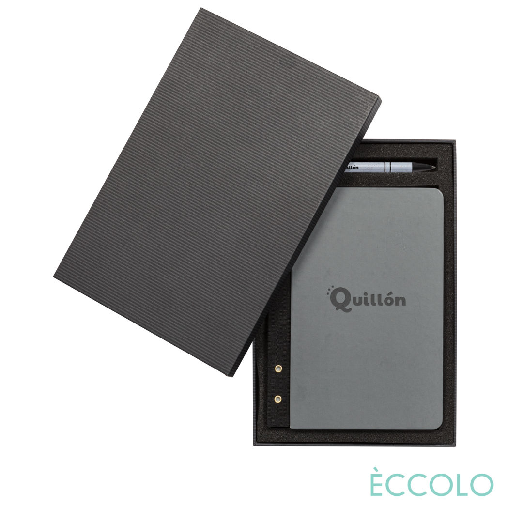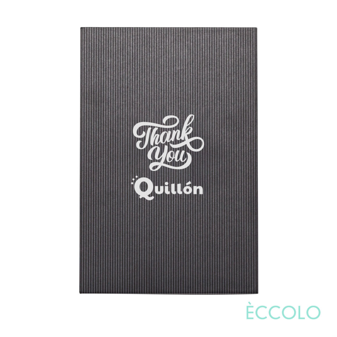 The stylish Eccolo® Fandango is a modern journal for the trend-setters and go-getters. A great everyday hardcover notebook with a striking black grommet spine. The Fandango Journal & Austen Pen Gift Set features…- P2372 Austen Pen: Click action ballpoint pen made from Eco-friendly composite wheat straw material with a stylus clicker.- Black die-cut foam Gift Box- Hard non padded cover- Black textured and Grommet Spine- Flexible Spine for total Lay Flat opening- 192 White lined pages- FSC Certified Acid-Free 80-gram paper- Gray end pages- Undated calendar pages in the back (12-Month Spreads).- Journal size: 6″ x 8.25″*Belly Band & Promo Page Inserts Optional. See Decorating Info for details. 6.0″ W x 8.25″ H