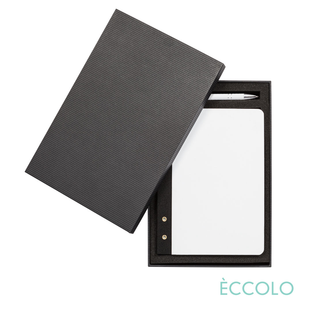 The stylish Eccolo® Fandango is a modern journal for the trend-setters and go-getters. A great everyday hardcover notebook with a striking black grommet spine. The Fandango Journal & Kurt Pen Gift Set features…- P319 Kurt Stylus Pen: Aluminum click-action ballpoint pen with stylus, chrome trim and medium German made refill. – Black die-cut foam Gift Box- Hard non padded cover- Black textured and Grommet Spine- Flexible Spine for total Lay Flat opening- 192 White lined pages- FSC Certified Acid-Free 80-gram paper- Gray end pages- Undated calendar pages in the back (12-Month Spreads).- Journal size: 6″ x 8.25″*Belly Band & Promo Page Inserts Optional. See Decorating Info for details. 6.0″ W x 8.25″ H