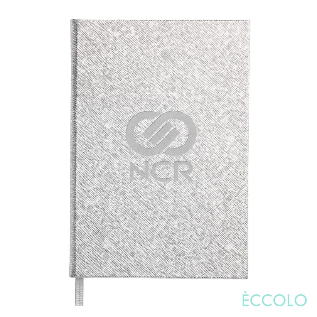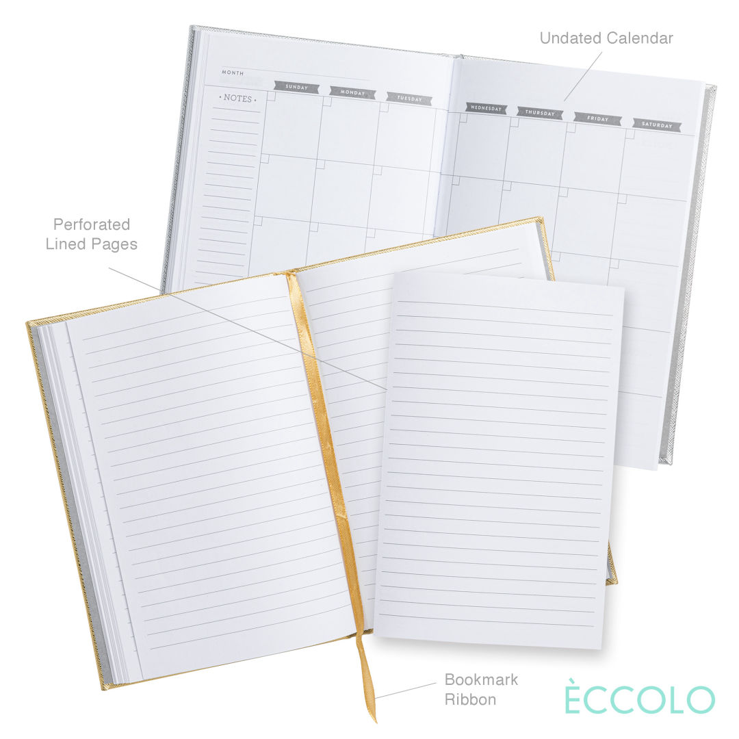 The Eccolo® Hip-Hop Metallic Journal combines a striking gold or silver metallic finish with a flexible cover for a modern, stylish look. Perfect for on-the-go writing, this journal offers both durability and a touch of flair to your daily notes and ideas.The Eccolo® Hip-Hop Journal features: – 256 lined pages- Lay-flat binding- A matching bookmark ribbon- Un-dated calendar – Perforated pages*Belly Band & Promo Page Inserts Optional. See Decorating Info for details. 6.0″ W x 8.0″ H