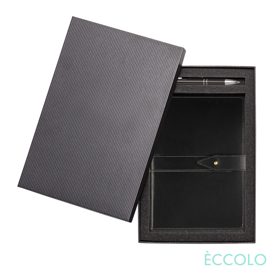 True legends are remembered forever. The Legend journal collection is both memorable and affordable. Featuring the look and feel of rich leather, these journals will represent your brand with style and sophistication.The Legend Journal & Clicker Pen Gift Set Features…- P197 Clicker Pen: Aluminum click-action ballpoint pen with chrome trim and medium German-made refill. – Black die-cut foam Gift Box- Stitched Leatherette FlexiCover- Elegant post closure- 256 ivory lined pages- Acid-free 80-gram paper- Cool gray end pages- Bookmark ribbon (color matched). *Belly Band & Promo Page Inserts Optional. See Decorating Info for details. 5.5″ W x 8.25″ H