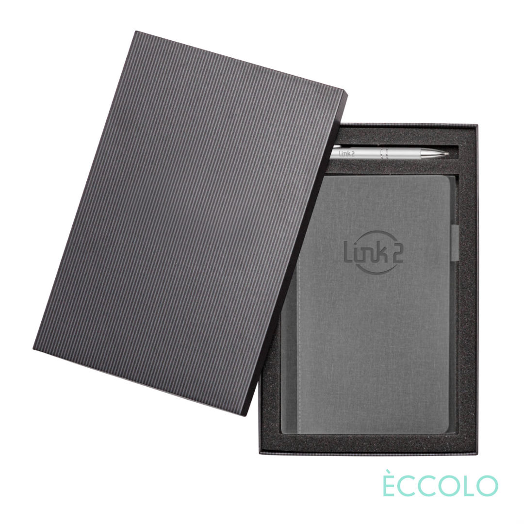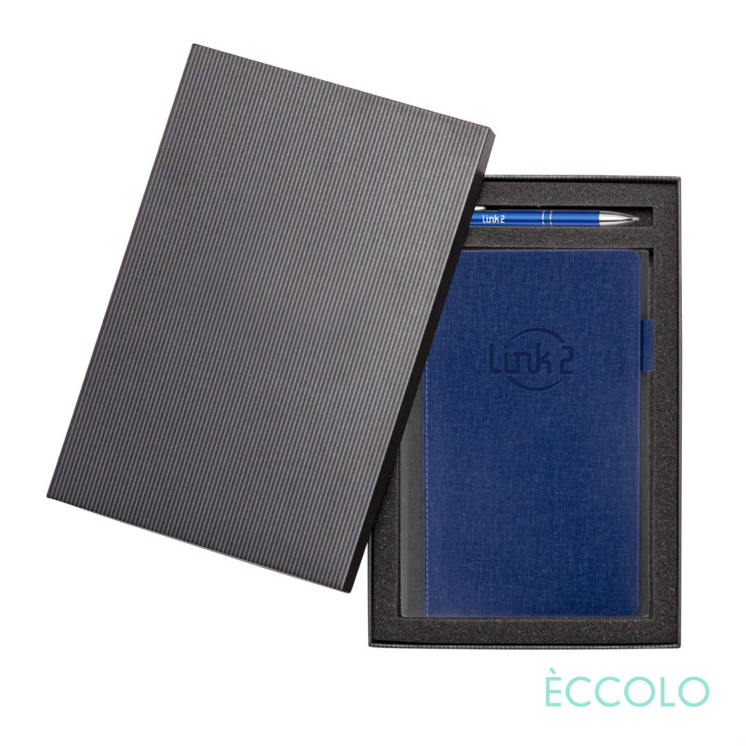 Your brand deserves the class and style of our Nashville journal! The two-tone design, magnetic flap closure, and fabric pen loop are sure to make this everyone’s new favorite. The Nashville Journal & Clicker Pen Gift Set Features…- P197 Clicker Pen: Aluminum click-action ballpoint pen with chrome trim and medium German made refill. – Black die-cut foam Gift Box- Stitched Hardcover with Magnetic flap closure- 192 white narrow lined pages- Acid-free 80-gram paper- Cool gray end pages- Fabric pen loop (color matched)- Bookmark ribbon (color matched)- Undated calendar pages in back (12-month spreads).*Belly Band & Promo Page Inserts Optional. See Decorating Info for details. 6.0″ W x 8.0″ H