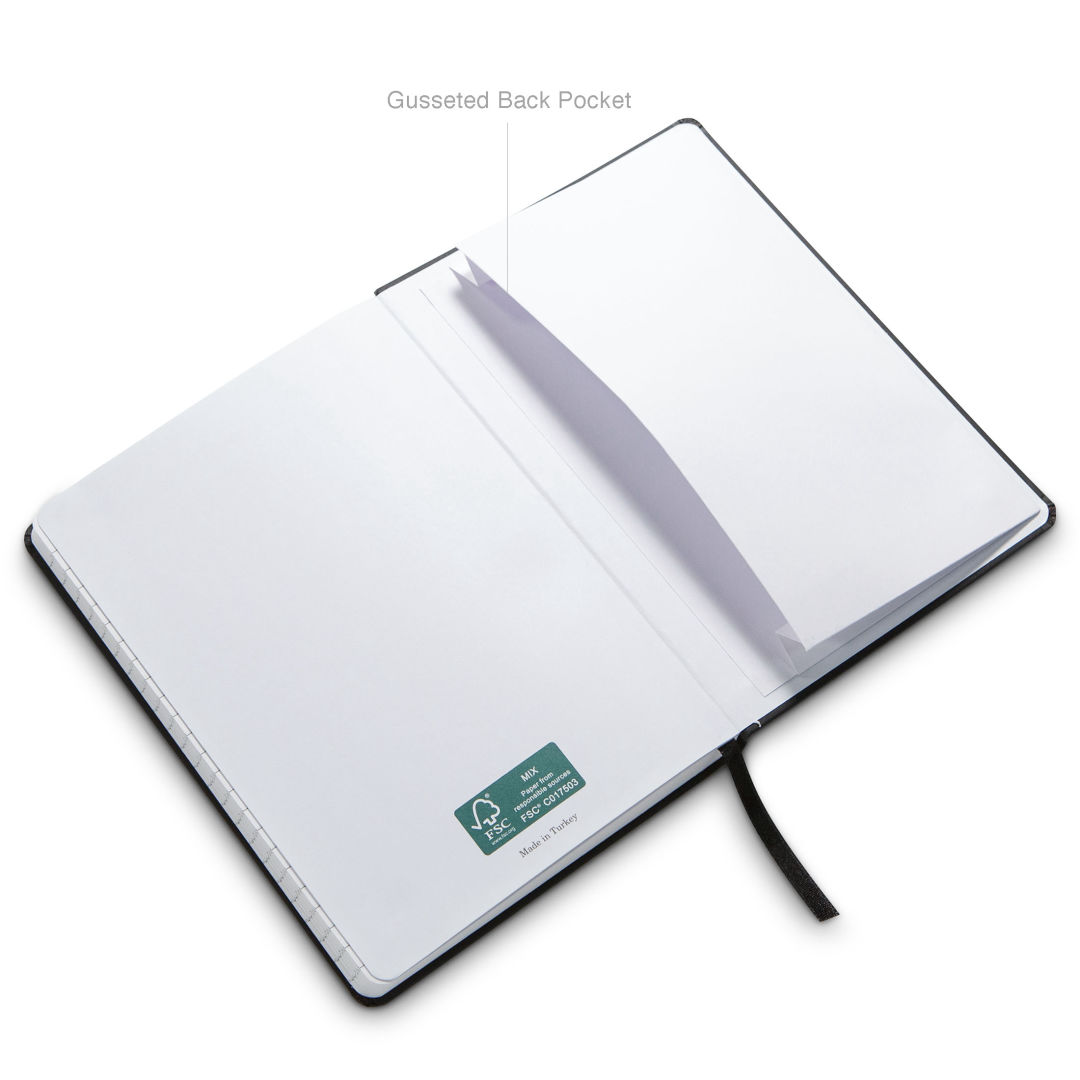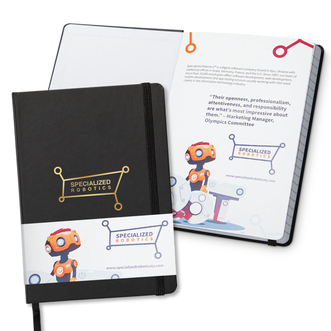 The “everything you need and more” journal. With all of the bells and whistles found in journals twice the price, our Techno journals are the top choice to get the most impact for your budget. The Techno Journal Features…- Smooth hardcover- 192 white, college ruled pages- FSC certified, 80 gram paper- Elastic band closure (color matched)- Ribbon marker (color matched)- Gusseted back pocket. – Journal size: 5″ x 7″*Belly Band & Promo Page Inserts Optional. See Decorating Info for details. 5.0″ W x 7.0″ H