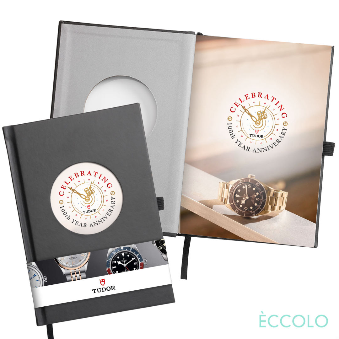 The Eccolo® Zorba Diecut Cover Hardcover Journal stands out with its die-cut design, offering both durability and artistic flair. The front cover features a circular die-cut window that reveals your printed logo on the inside journal page. Opening on the cover is 3″ in diameter. 1 promo page is included.The Eccolo® Zorba Journal features: – 256 lined pages- Lay-flat binding- A matching bookmark ribbon- Pen loop- Un-dated calendar – Perforated pages*Belly Band & Promo Page Inserts Optional. See Decorating Info for details. 6.0″ W x 8.0″ H