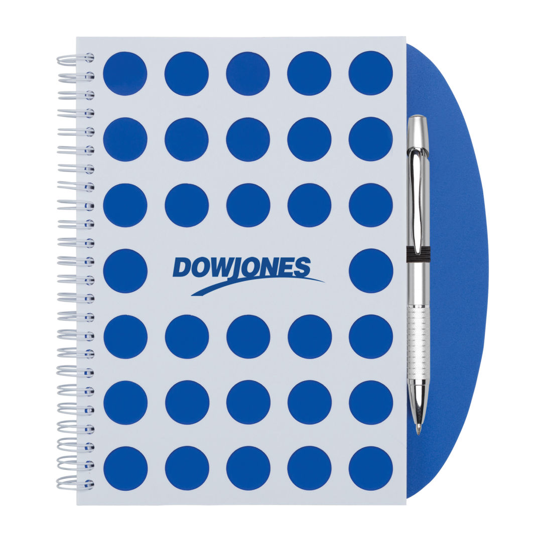 5 7/8″ x 8 3/8″ polypropylene notebook with white double spiral binding, white frosted front cover with die-cut holes, colored front page, matching elastic pen loop on cardboard back cover, 60 white lined sheets (non-refillable) and a matching P2123 plastic pen.