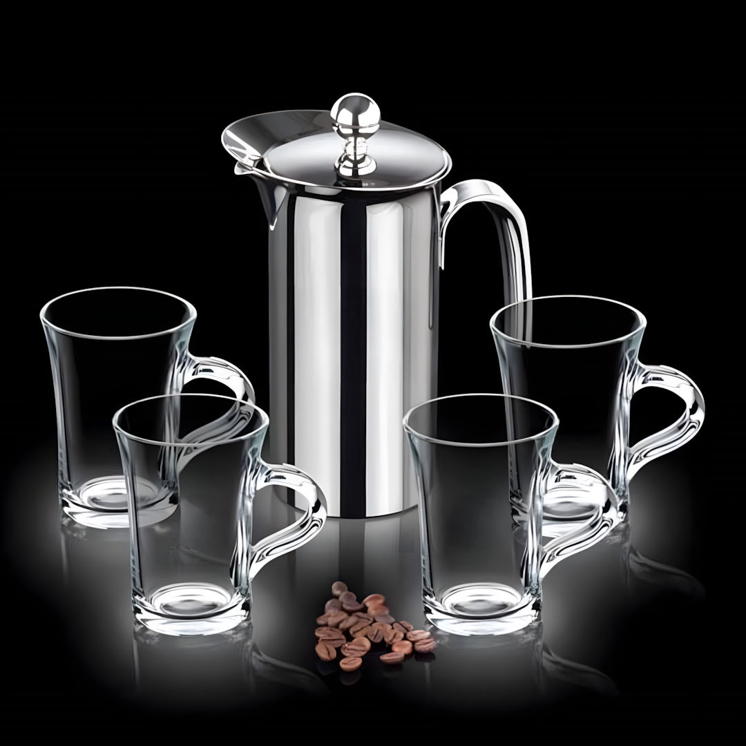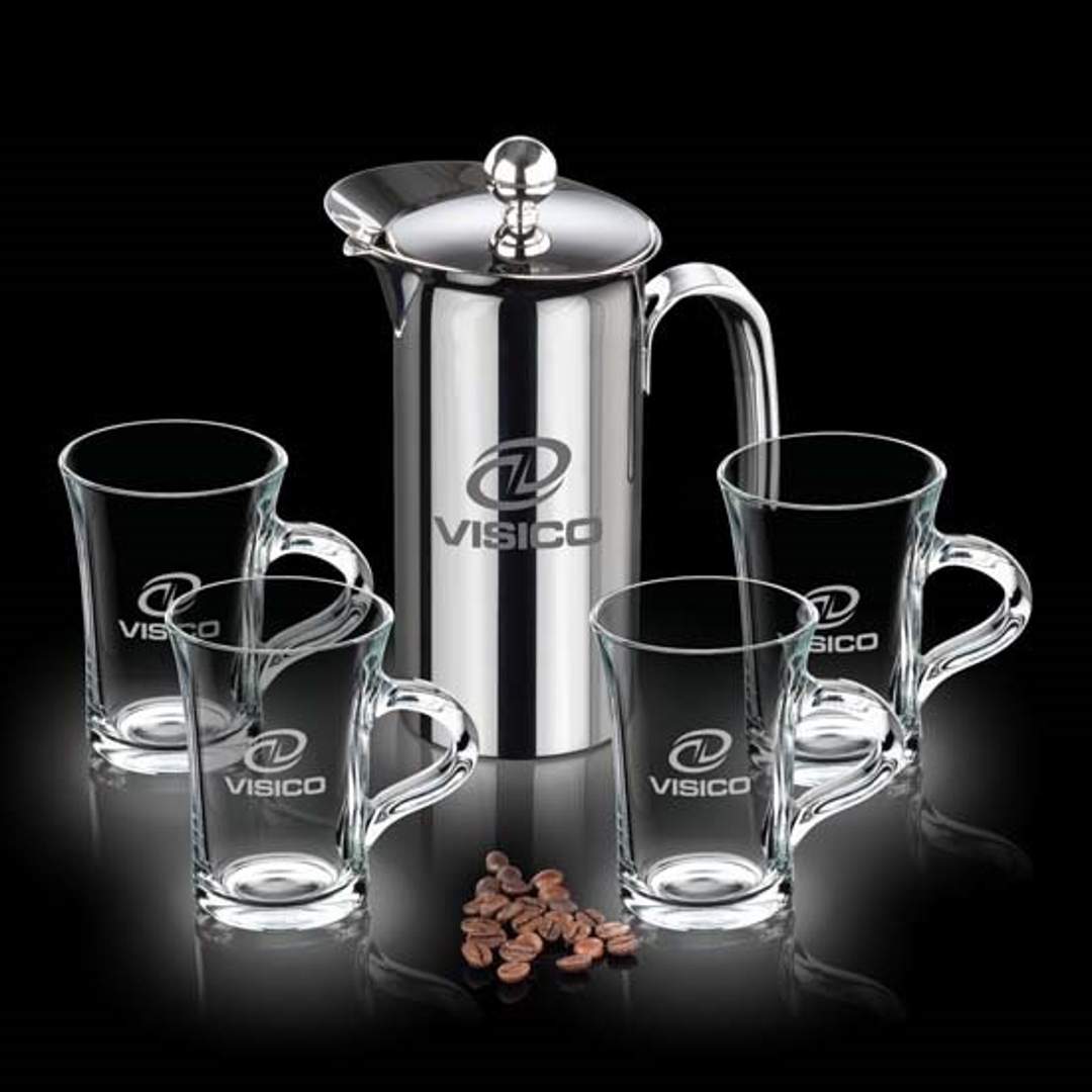 Spectacular Stainless Steel French Coffee Press Set. Restaurant Quality 18/8 Stainless Steel makes this an exquisite gift that will be cherished for years to come. Available with 2 or 4 coffee mugs. Other styles available.