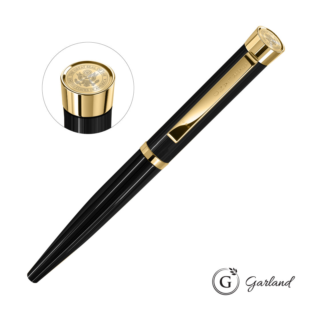 Take your Garland pen to the next level with our new, finely detailed Emblem top. Your purchase includes a laser-engraved, chrome-plated brass, Custom emblem top with nickel underlay and one additional location laser engraving. Available in our Executive style ballpoint and rollerball options. Since 1926, Garland pens have been crafted with brass internal components, guaranteed for life, and beautifully presented in an elegant gift box.Pen Size: 5.4″ W x 0.6″ H. 5.4″ W x 0.6″ H