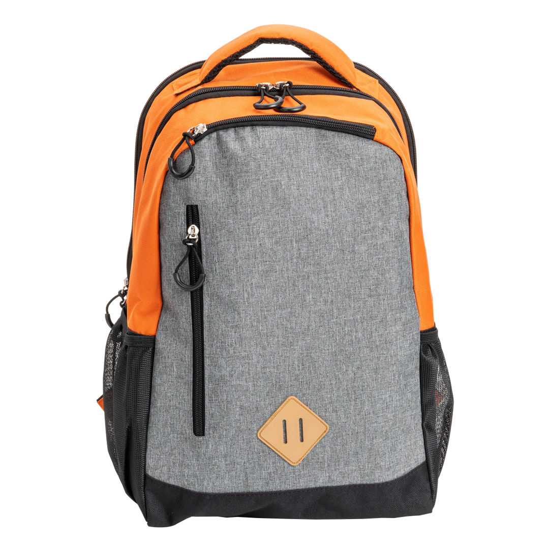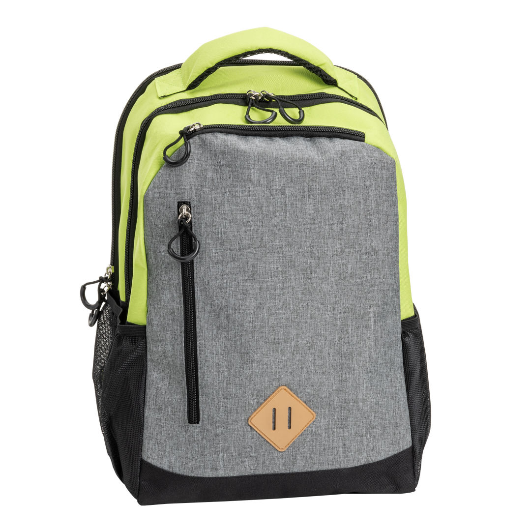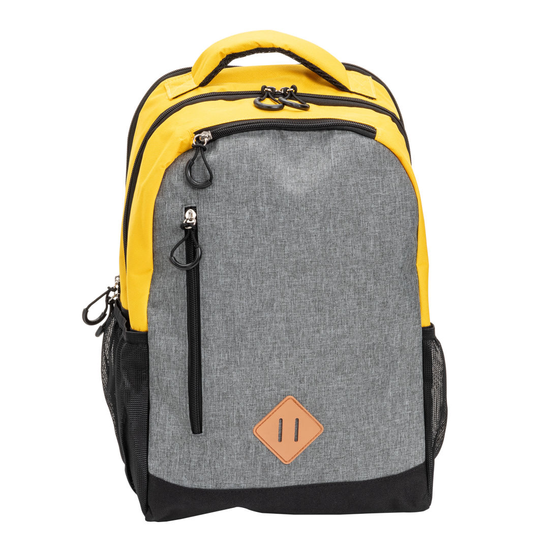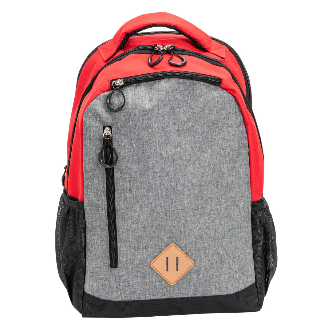The Gatewood Colored Backpack merges vibrant design with practicality, showcasing colored top and sides alongside a heather gray patterned front. It offers generous storage with two large zippered compartments, a front zippered pocket, a top zippered pouch, two mesh side pockets, and a handy lash tab at the bottom for added versatility. This backpack is the ideal choice for those seeking style and organization in their daily adventures. Main body fabric is made of 600D polyester and 300D melange polyester. The lining is made of 210D polyester.Product Size: 11.25″ W x 18.5″ H x 6″ D. 11.25″ W x 18.5″ H x 6.0″ D