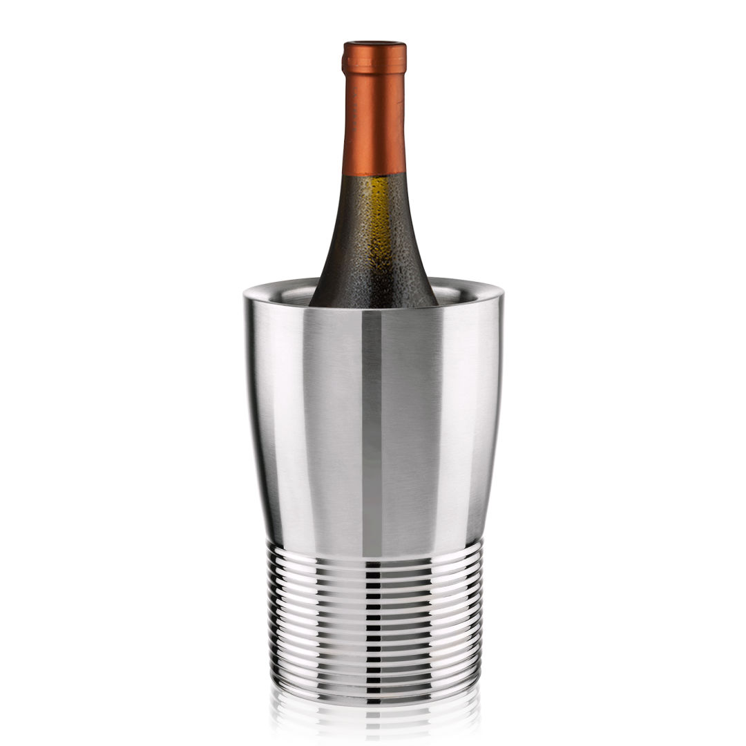 The Genoa Wine Cooler features a sleek stainless steel design with a distinctive ribbed base that adds both style and grip. Built to maintain the ideal temperature for your favorite wines, it’s perfect for dinner parties, celebrations, or casual entertaining. Modern and durable, this cooler is a practical yet elegant addition to any bar or tabletop. 5.0″ W x 7.375″ H x 5.0″ D