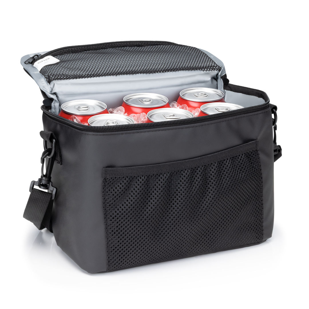 The Gower Cooler Bag is built with a tough 900D polyester exterior and a 15C PEVA lining to keep items cold and protected. It features a zippered main compartment, a zippered mesh pocket inside the lid, and a front mesh pouch for extra storage. Designed for convenience, it also comes with a sturdy carrying strap for easy transport.Product Size: 10″ W x 7.75″ H x 6.5″ D. 10.0″ W x 7.75″ H x 6.5″ D