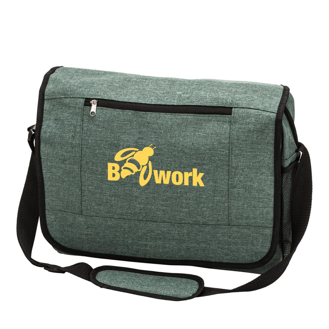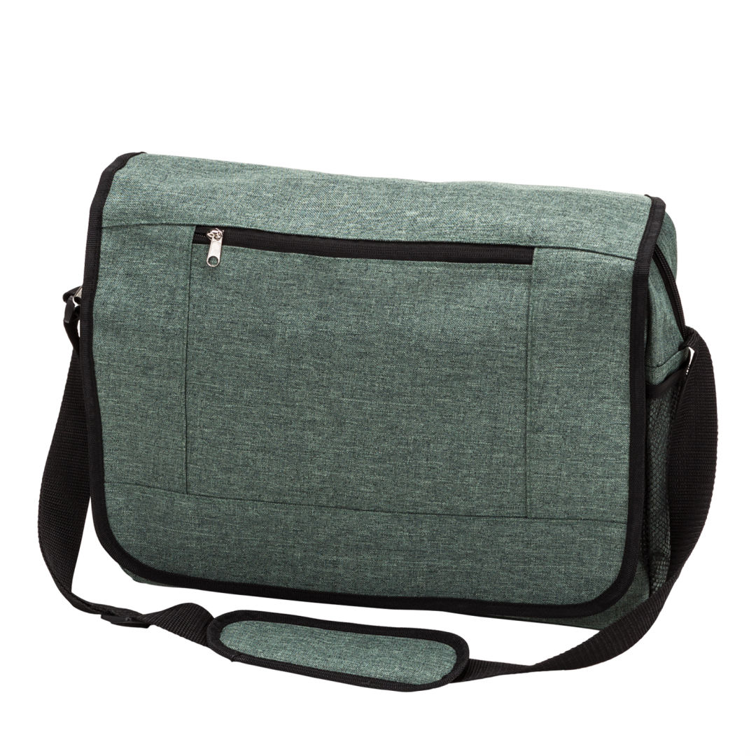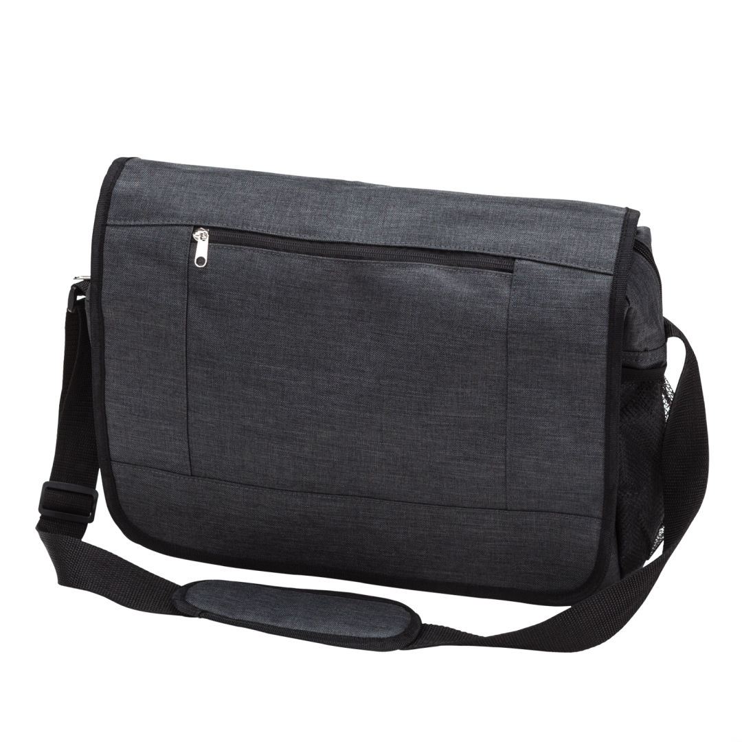 Commuter bag from 600D interwoven heather poly-fabric- Weather-proof lined design with luggage strap for suitcases- Features front zipper utility pocket and zipper under flap to secure contents- Stretchable mesh side pocket for bottles/umbrellas- Extendable shoulder strap with cushioned padProduct Size: 16.5″ x 12.5″ x 5″. 16.5″ W x 12.5″ H x 5.0″ D