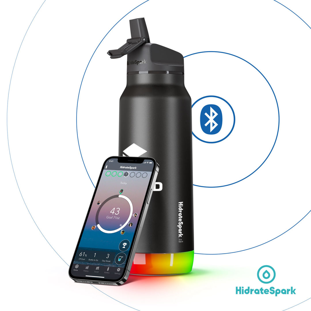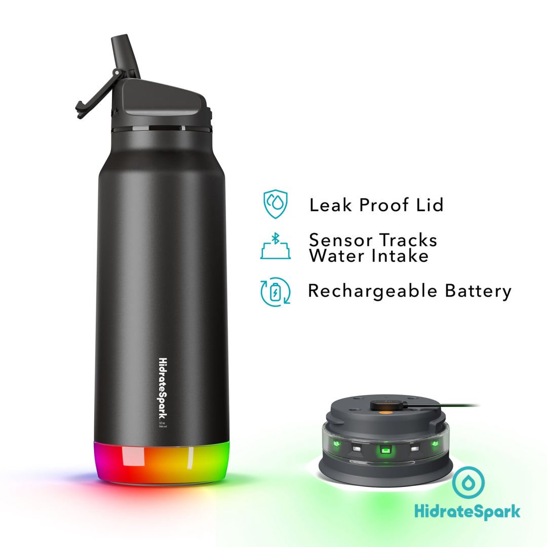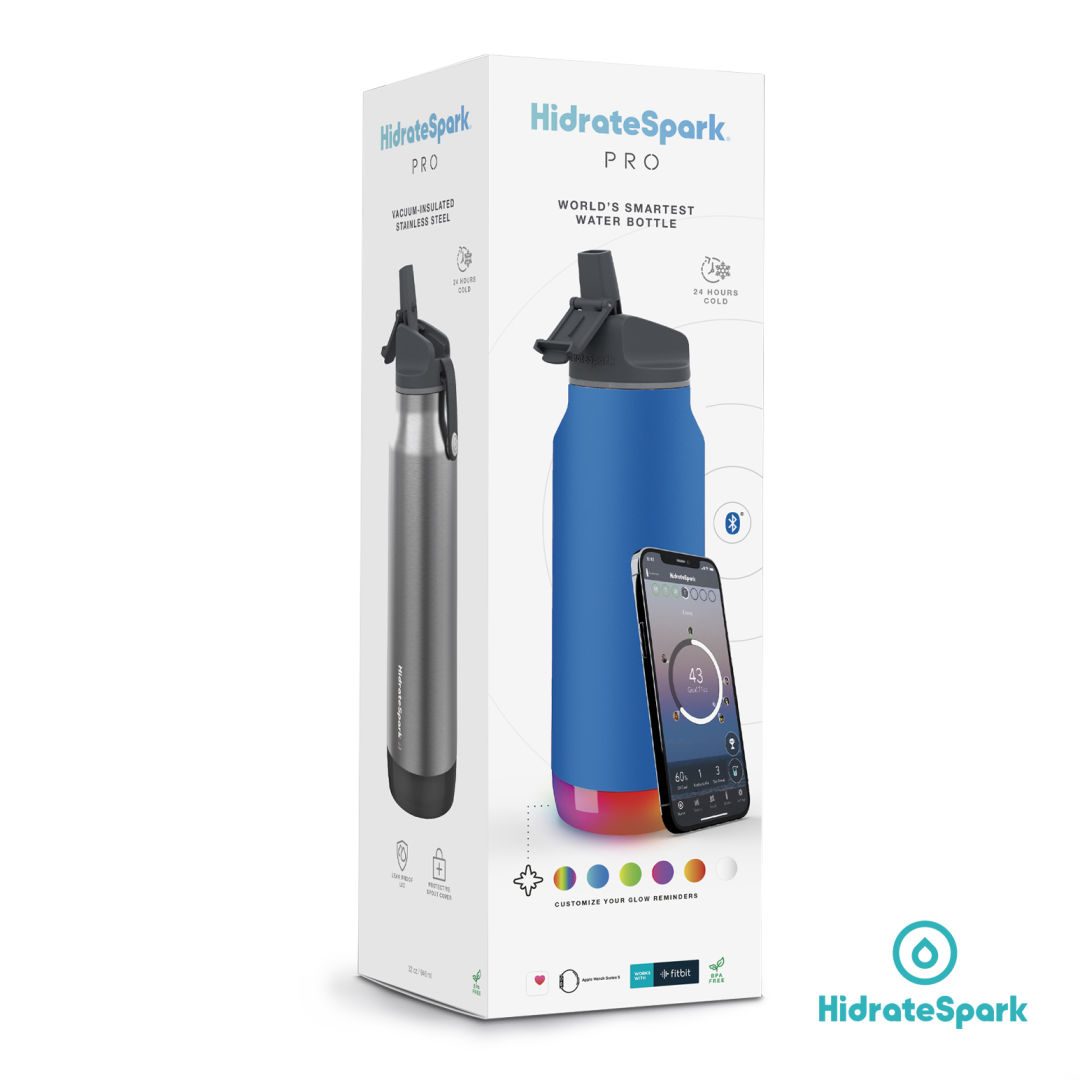 HidrateSpark PRO, the world’s smartest water bottle ever created. Available in stainless steel vacuum insulated material, keeping drinks cold for up to 24 hours and lightweight, shatter and odor-resistant Tritan ™ plastic. LED smart sensor “puck” glows to remind you when it’s time to drink and tracks your water intake by syncing via Bluetooth to the HidrateSpark App. Choose from 2 lid options and make it your own with custom glow colors in the app.Product Size: 3.8″ W x 11.3″ H. 3.8″ W x 11.3″ H