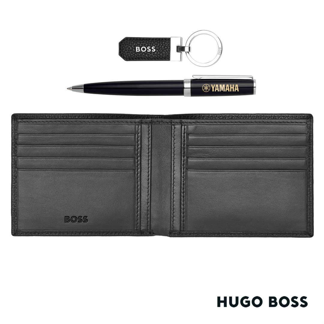Experience elegance and utility combined with the Hugo Boss® Ballpoint Pen, Key Ring & Wallet Set. Crafted to perfection, the set exudes sophistication with a sleek ballpoint pen, a stylish key ring, and a meticulously designed wallet in classic black. Featuring two currency compartments, eight card slots, three side compartments, and a convenient coin slot.Giftbox Size: 6.85″ W x 1.2″ H X 5.75″ D. 6.85″ W x 1.2″ H x 5.75″ D