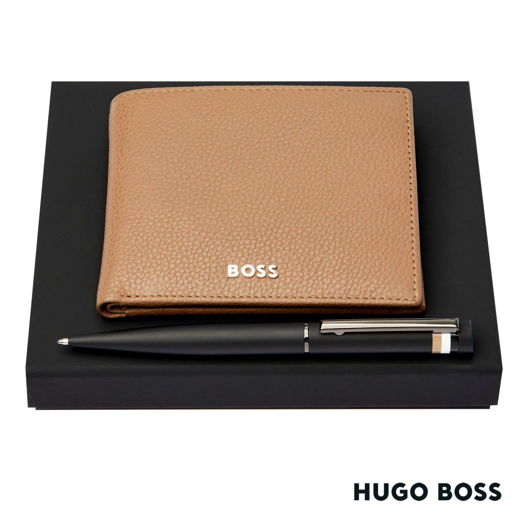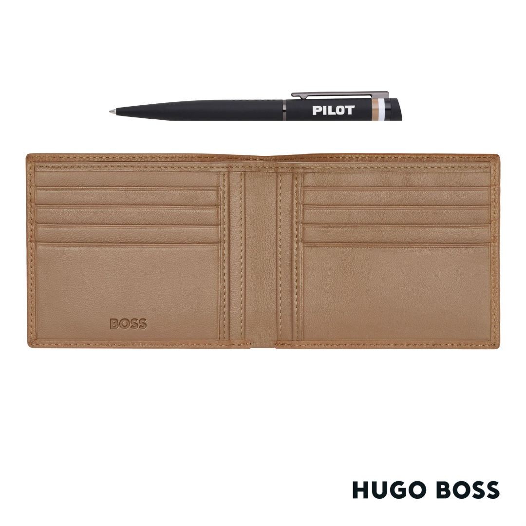 Elevate your essentials with the Hugo Boss® Ballpoint Pen & Leather Wallet Set, a fusion of timeless style and functionality. Crafted with precision, the set features a sleek ballpoint pen paired with a luxurious leather wallet, exuding sophistication in every detail. GiftBox Size: 6.85″ W x 1.2″ H x 5.75″ D. 6.85″ W x 1.2″ H x 5.75″ D