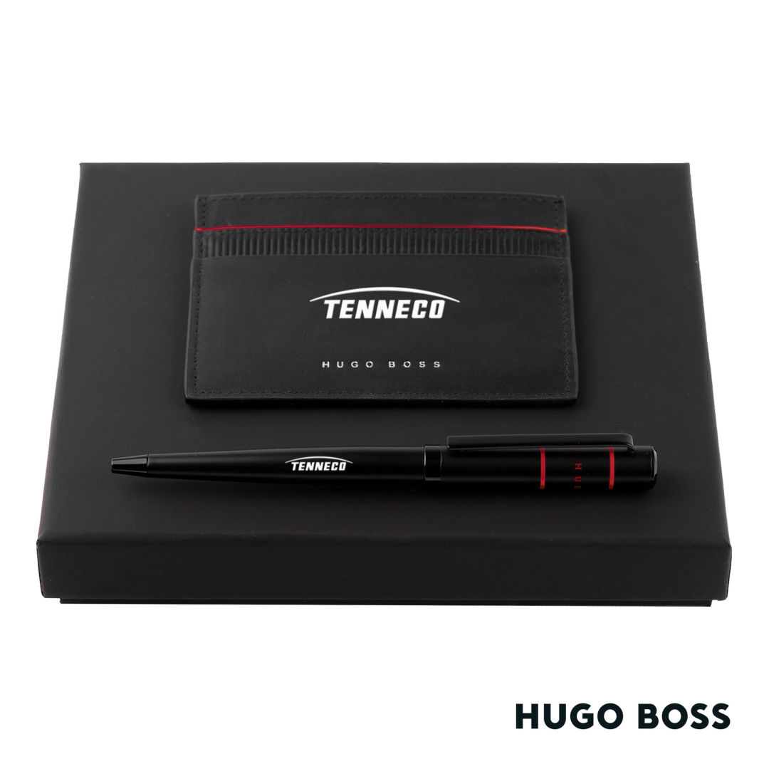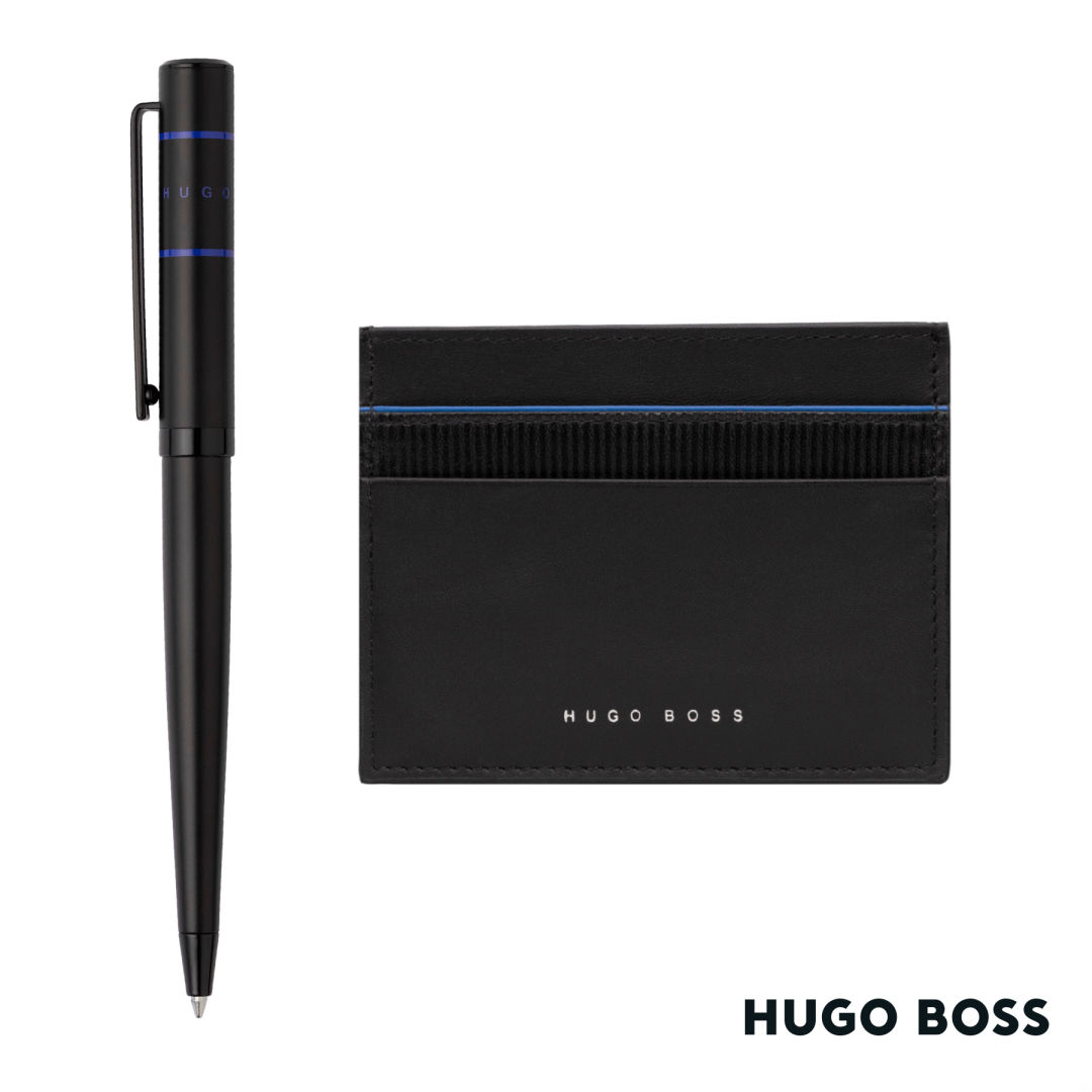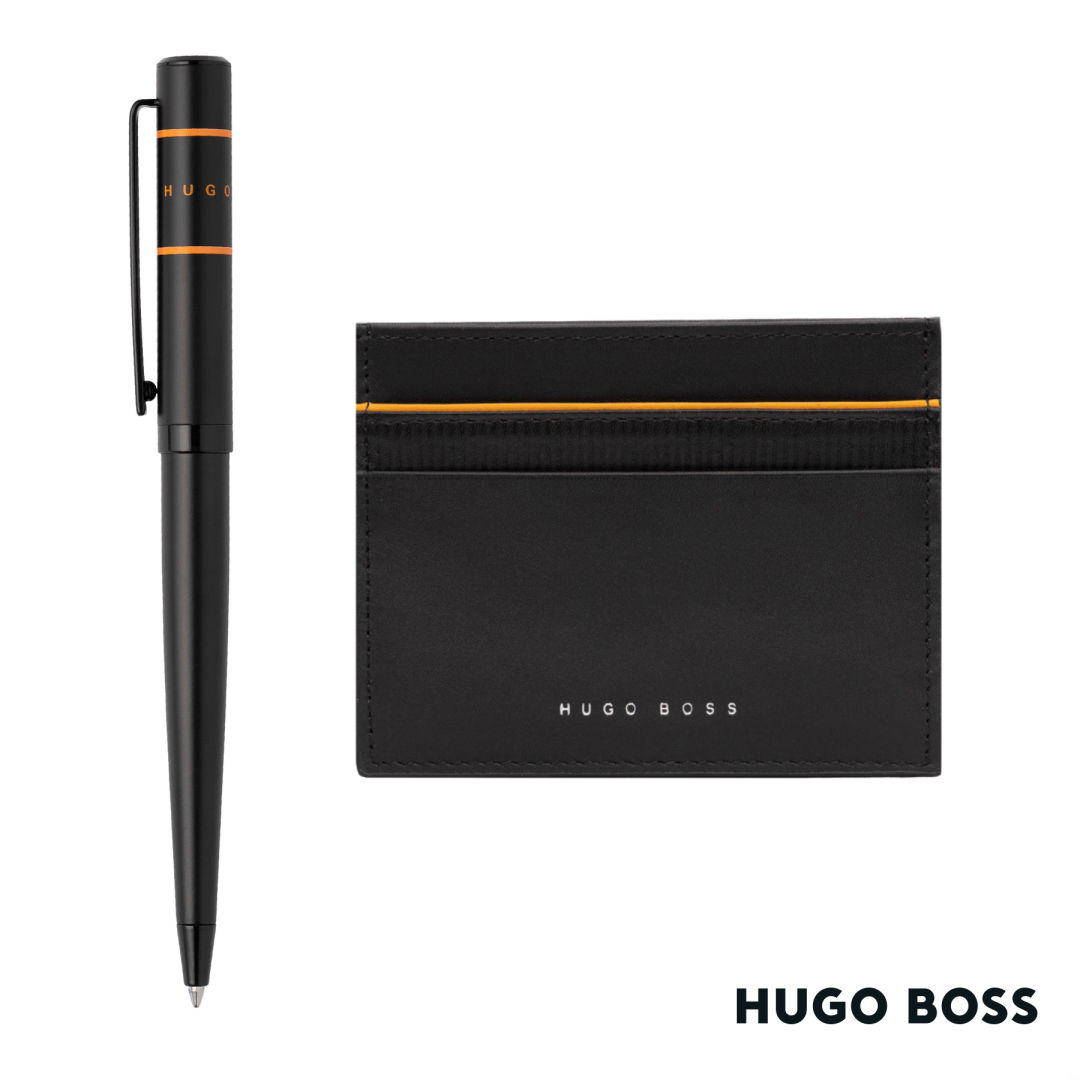 Hugo Boss® Gear Card Holder and Ribbon Matrix Ballpoint Pen is a classy and sophisticated executive gift set. The Ribbon Matrix is a simple yet striking pen with a black finish and fine-colored lines. Made of soft leather, the matching cardholder is clean and subtlety detailed with its ridged stripe, pop of color, and embossed Hugo Boss logo. The cardholder features 2 card slots in the front and back. This is a set that gives a modern and youthful feel. 6.0″ W x 5.0″ H