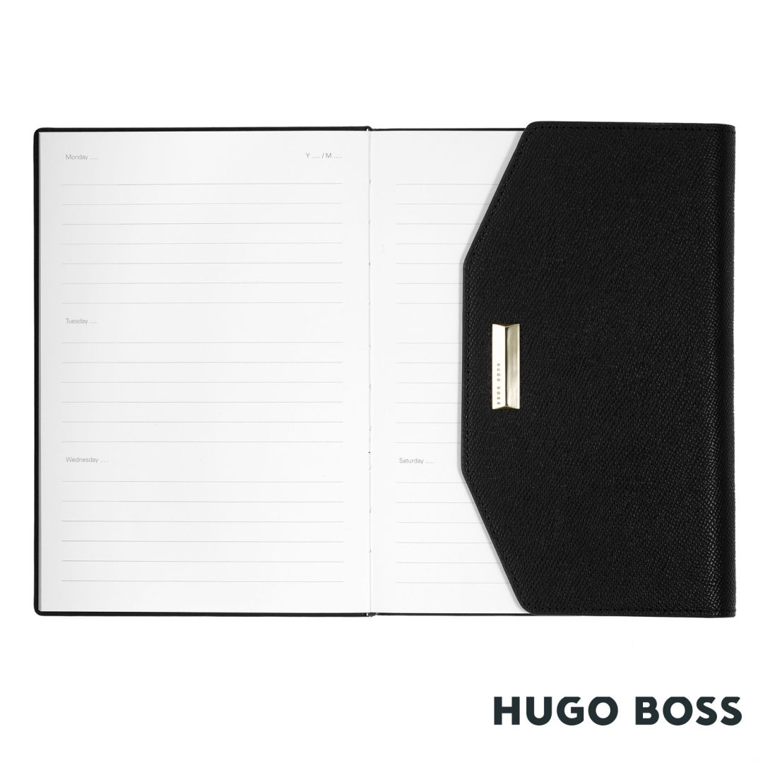 The 6.25″ x 8.5″ Portfolio from the “Vivid” line is vibrant and feminine. The soft, textured material is enhanced by light gold-plated accents on the art-deco inspired metallic signature. The pages are undated and provide ample space for personal notes. The product is available in black. Ideal for an organized year with a chic and elegant look.The Portfolio includes 120 Lined sheets. 8.5″ W x 6.25″ H x 1.25″ D