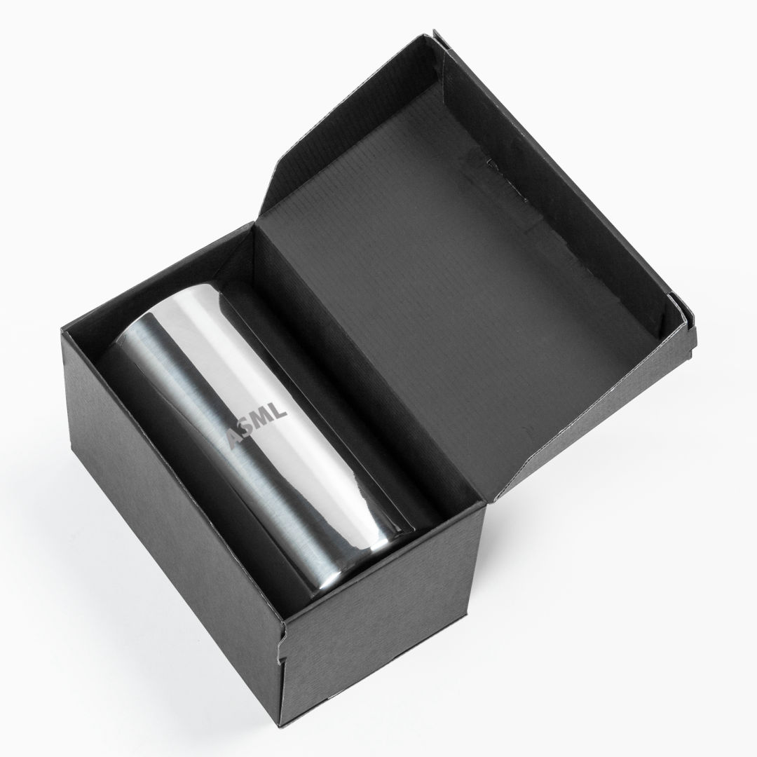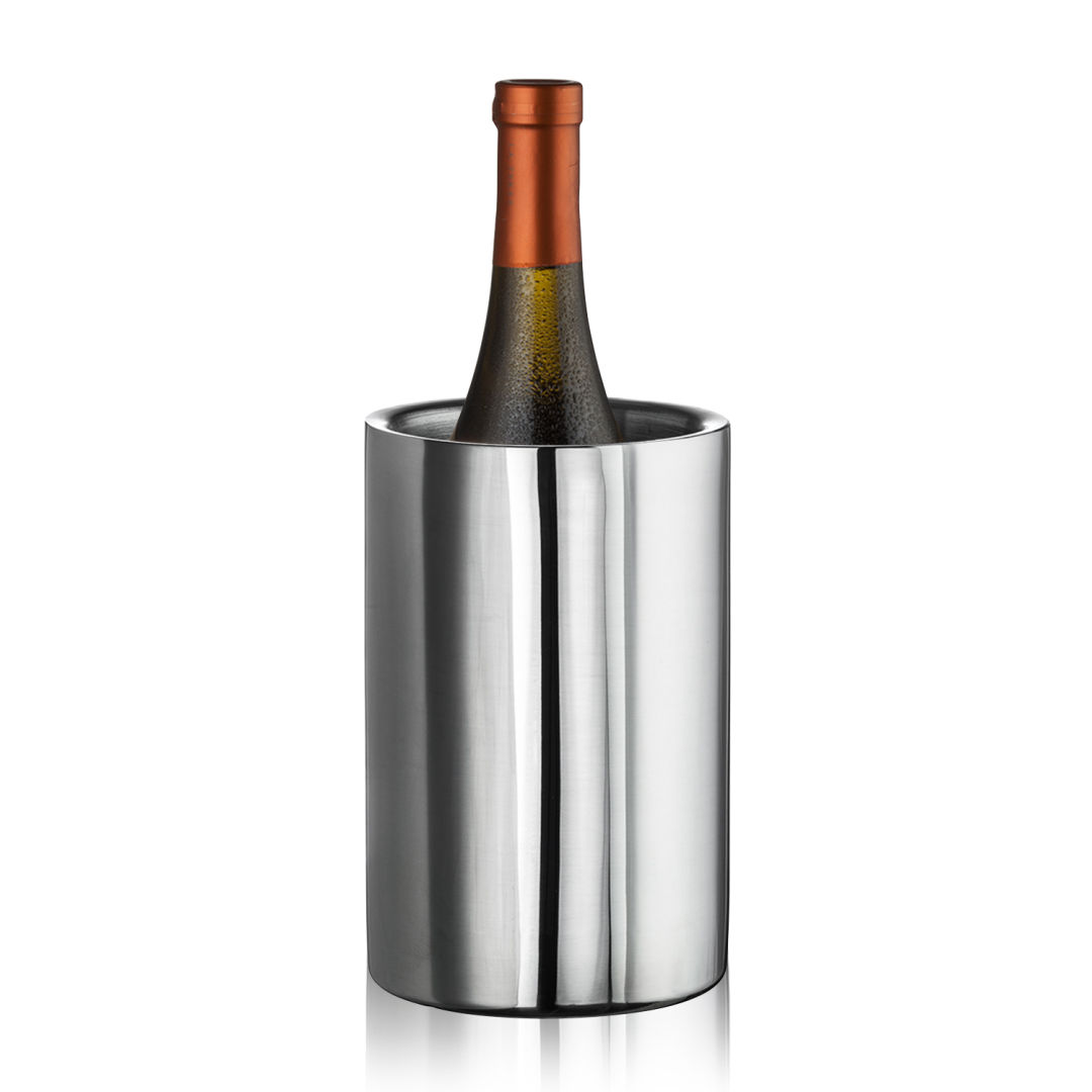 Sleek and Polished Stainless Steel Wine Cooler. Fits a standard 750ml bottle and is a great way of promoting your brand or message. 4.75″ W x 7.75″ H