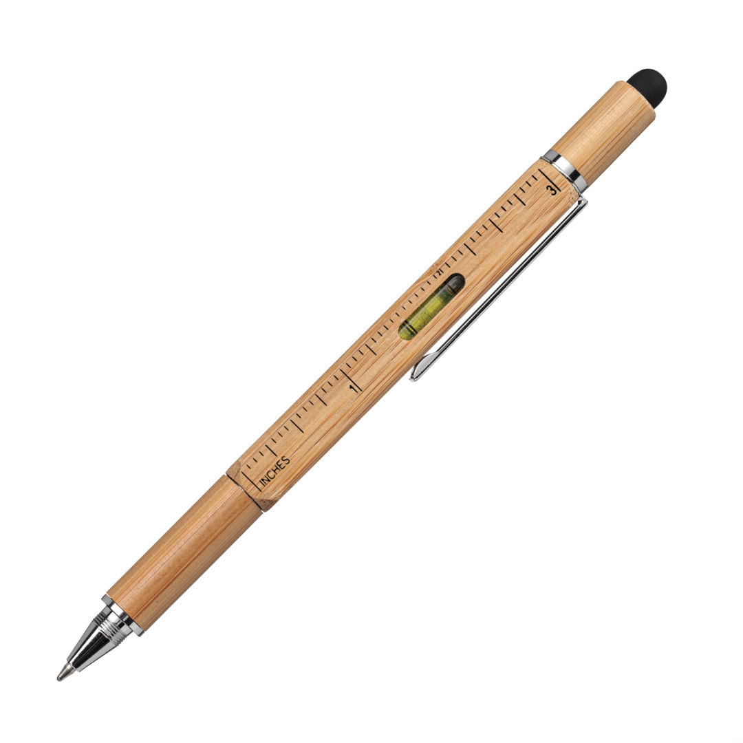 Jorge eco-friendly Bamboo twist-action pen with stylus. Features a lined ruler in cm and inches and a mini built-in level. Also includes a twist-off stylus cap that reveals interchangeable #1 Philips or Flat Head bits. SRG will be donating 1% of proceeds from this product to Plastic Bank, supporting their mission of cleaning ocean plastic and reprocessing the materials as Social Plastic®