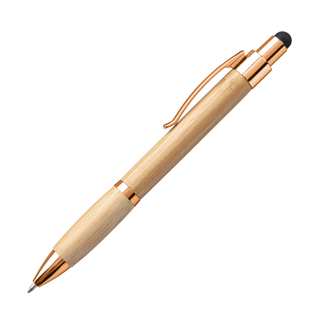 The Kafza click-action ballpoint pen features an eco-friendly bamboo barrel with a comfort grip and polished chrome accents.