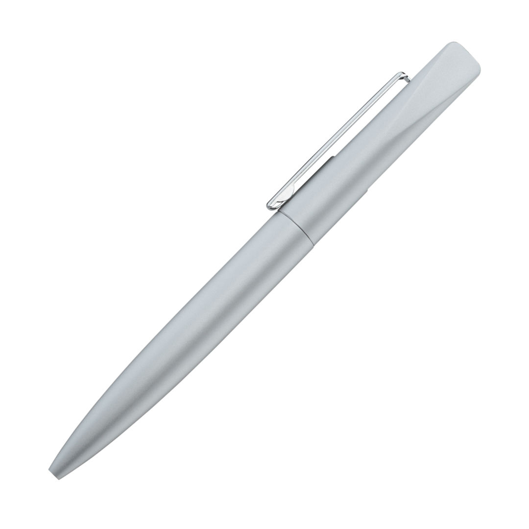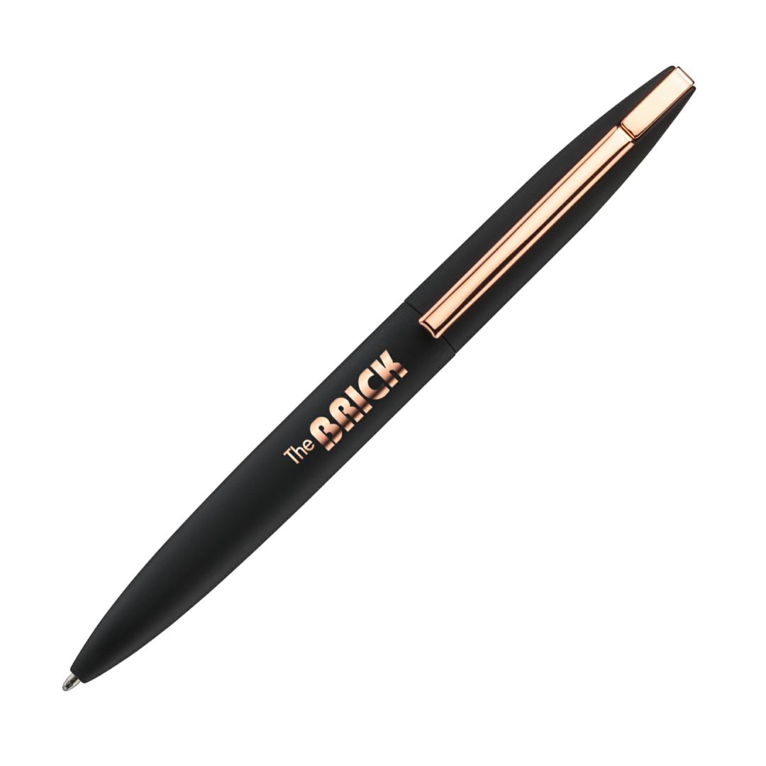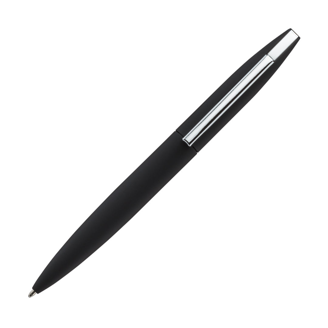 Metal twist-action ballpoint pen with chrome trim and rubber touch coating (silver excluded). 5.375″ W x 0.5″ H