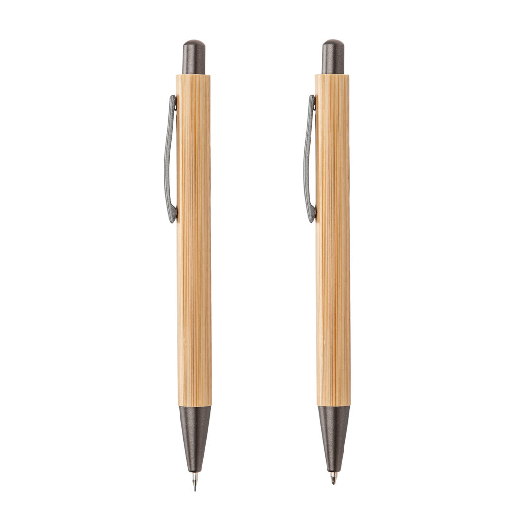 Lucky Clicker Bamboo Pen & Pencil Set features all-natural eco-friendly bamboo barrels and sleek gunmetal accents. Packaged in a wood grain finished recycled craft paper box.