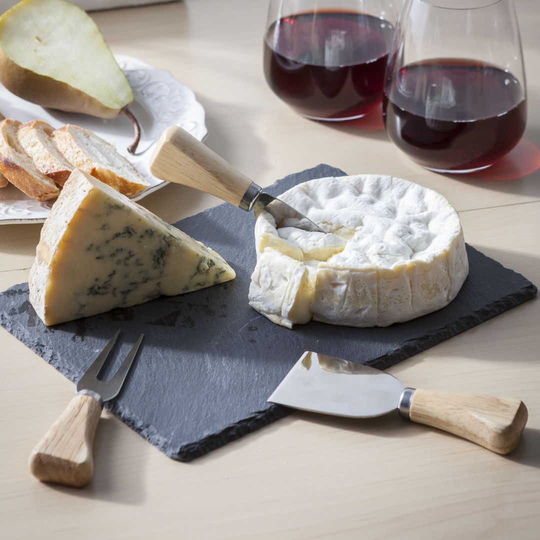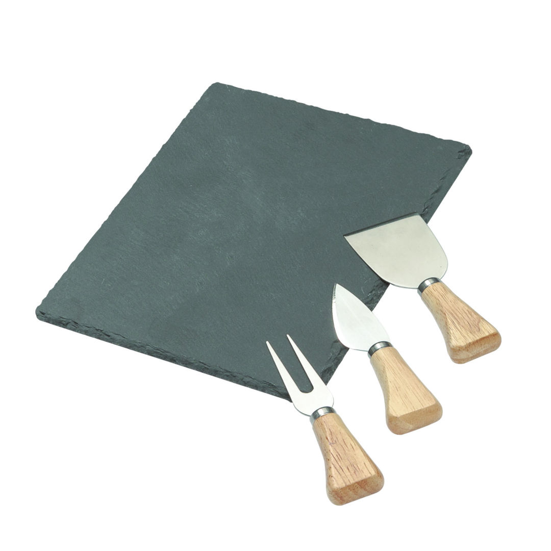 Artisan style, 4-piece, ancient, slate rock cheese serving set- Quarry-style hewn edges for that rustic & earthy, natural experience- Stain resistant, food-safe, chemically inert naturally cool slate- Includes 3 stainless steel cheese utensils with contoured wood handles- Hard cheese shaver, knife with spreader & cheese fork- Mirrored stainless steel with light grain handles- Host in style with the perfect cheese platter presentation- The slate can also be used for serving appetizers & moreProduct Size: 14″ x11″ Serving board: 7″ x 9.5″. 14.0″ W x 11.0″ D
