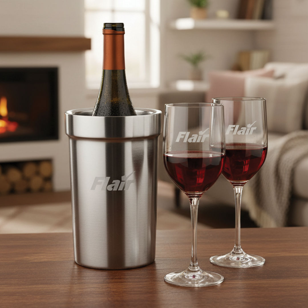 The Milano Wine Cooler & Wine Set combines sleek sophistication with practical functionality for the ultimate wine experience. Featuring a polished stainless steel cooler that maintains the ideal serving temperature and elegantly crafted wine glasses for a flawless presentation, this set is designed to impress. Whether for intimate gatherings or special celebrations, it brings modern style and timeless class to every pour. Various wine glass styles available.