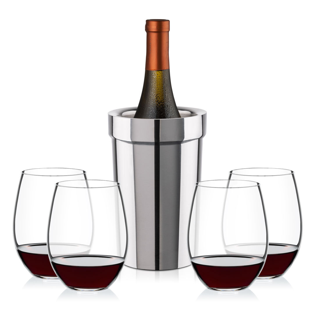 The Milano Wine Cooler & Wine Set combines sleek sophistication with practical functionality for the ultimate wine experience. Featuring a polished stainless steel cooler that maintains the ideal serving temperature and elegantly crafted wine glasses for a flawless presentation, this set is designed to impress. Whether for intimate gatherings or special celebrations, it brings modern style and timeless class to every pour. Various wine glass styles available.