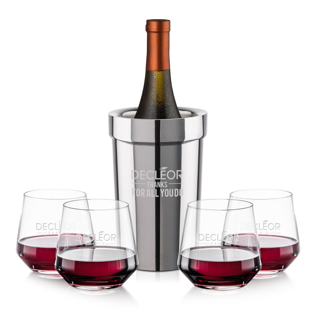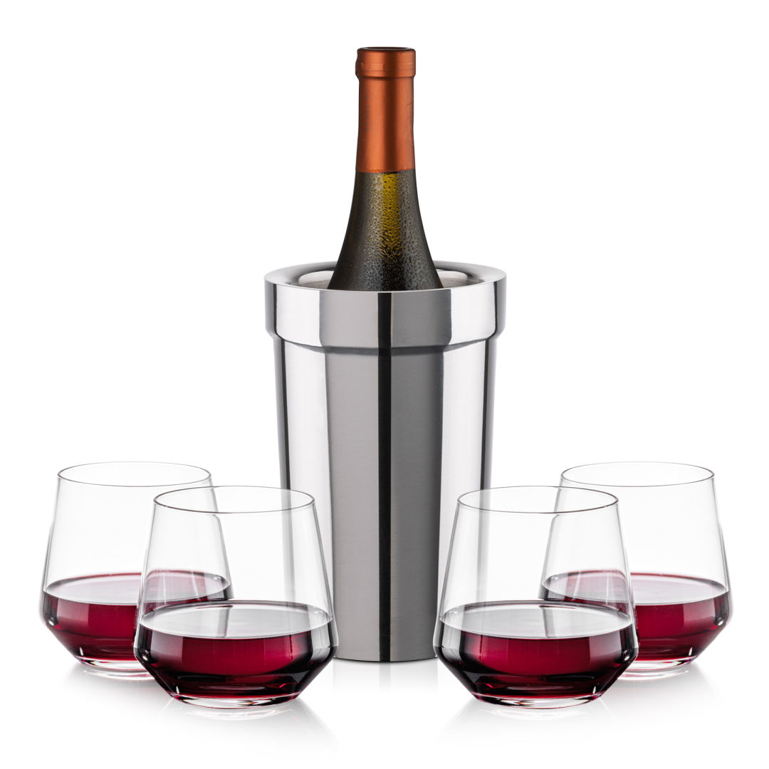The Milano Wine Cooler & Wine Set combines sleek sophistication with practical functionality for the ultimate wine experience. Featuring a polished stainless steel cooler that maintains the ideal serving temperature and elegantly crafted wine glasses for a flawless presentation, this set is designed to impress. Whether for intimate gatherings or special celebrations, it brings modern style and timeless class to every pour. Various wine glass styles available.Capacity: Glass 13.5oz