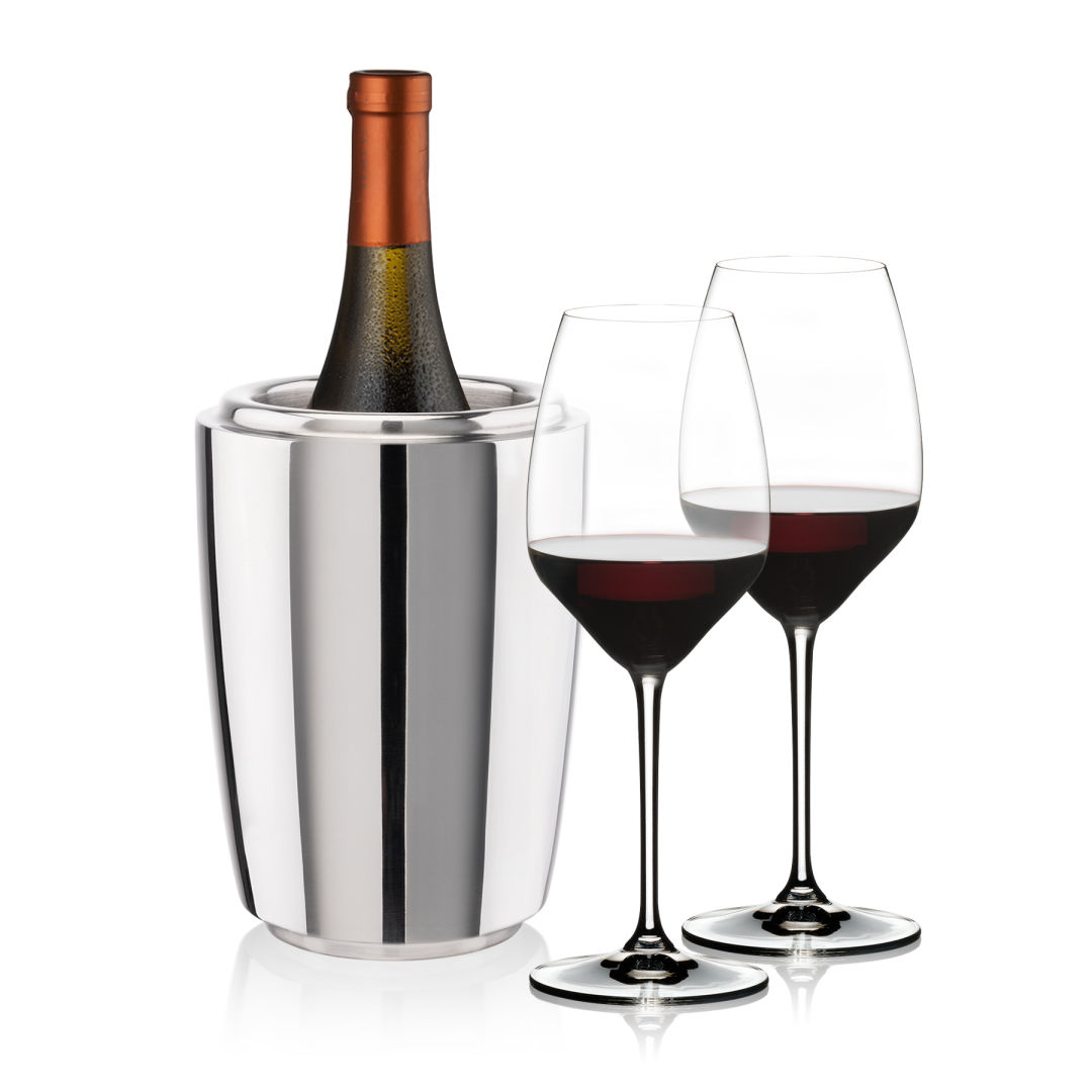 The Pescara Wine Cooler & Wine Glass Set is a refined pairing designed for effortless elegance and enjoyment. The sleek stainless steel Pescara cooler keeps your wine perfectly chilled, while the accompanying crystal-clear stemmed glasses showcase each pour with brilliance and style. Perfect for entertaining, gifting, or elevating your own collection, this set combines modern sophistication with timeless appeal. Various wine glass styles are available.
