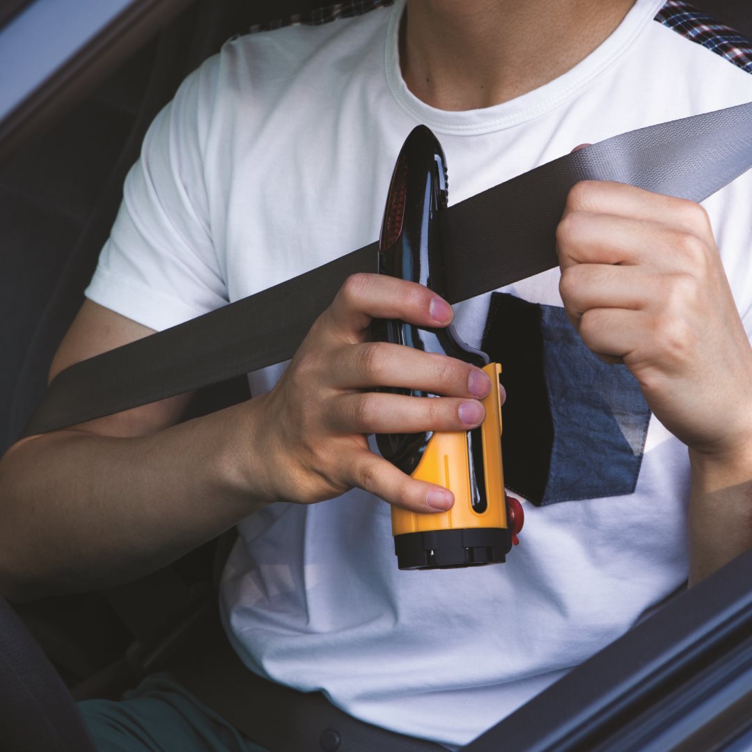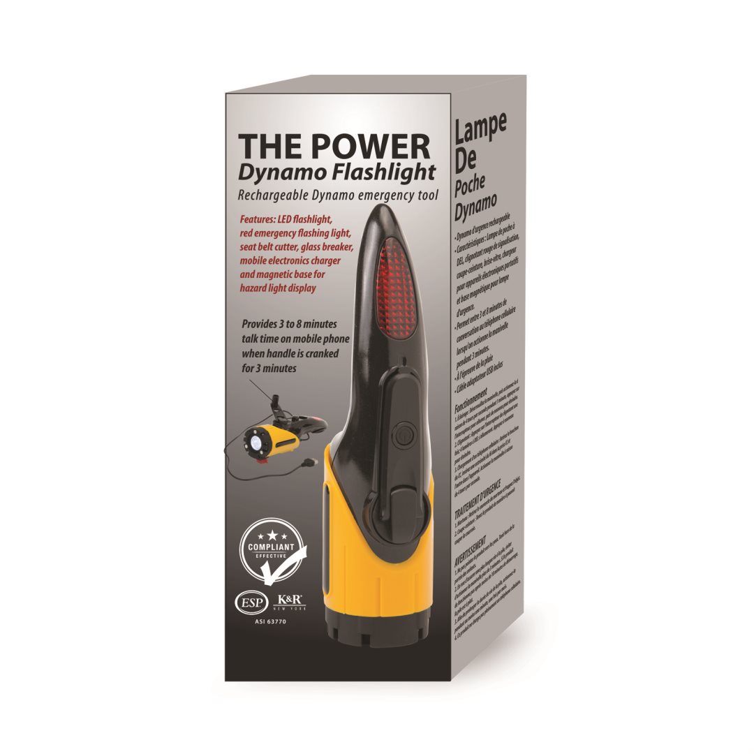 Rechargeable Dynamo emergency tool- Features: LED flashlight, red emergency flashing light, seat belt cutter, glass breaker, mobile electronics charger and magnetic base for hazard light display- Provides 3 to 8 minutes talk time on mobile phone when handle is cranked for 3 minutes Rainproof USB adapting cable includedProduct Size: 3″ x 8.75″. 3.0″ W x 8.75″ H