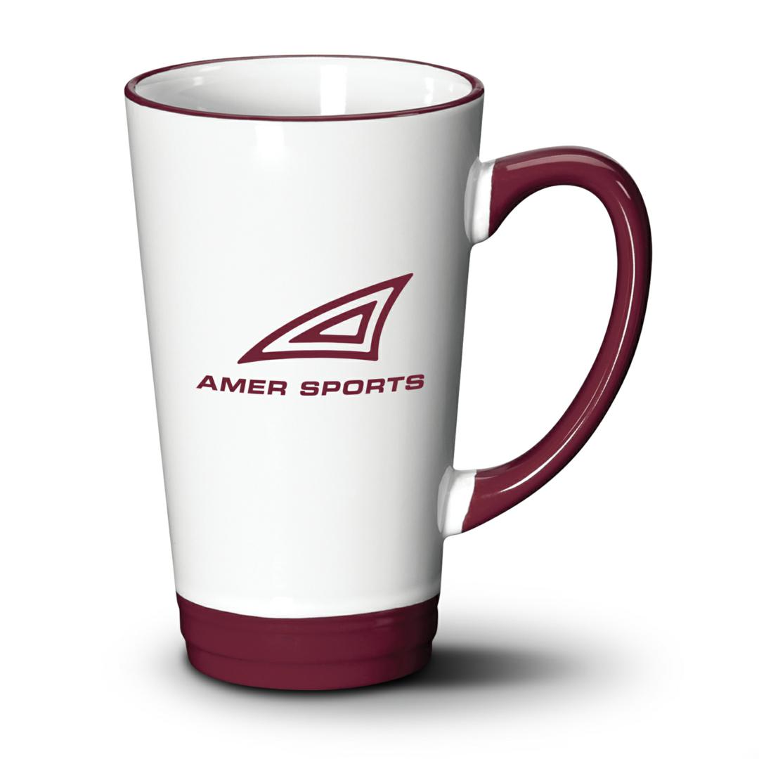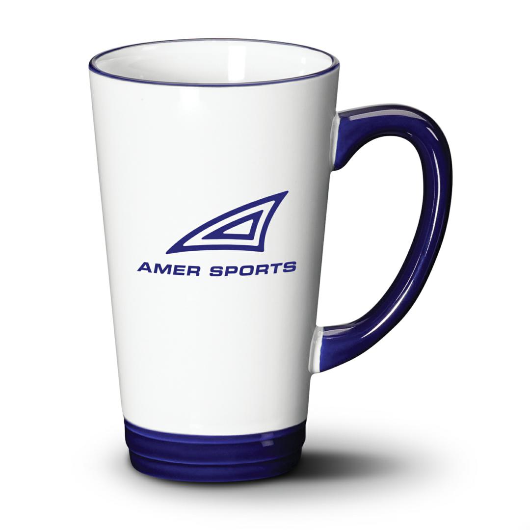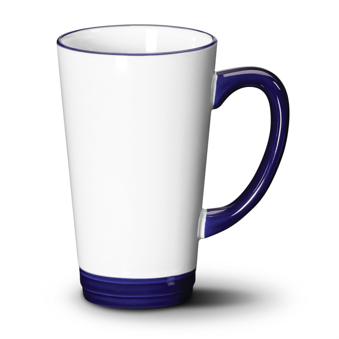 The Raquel ceramic mug features a rich white glaze with a sculpted base glazed in five different colors. The tapered tall silhouette is enhanced with a handle and rim glazed with the same color as the base.