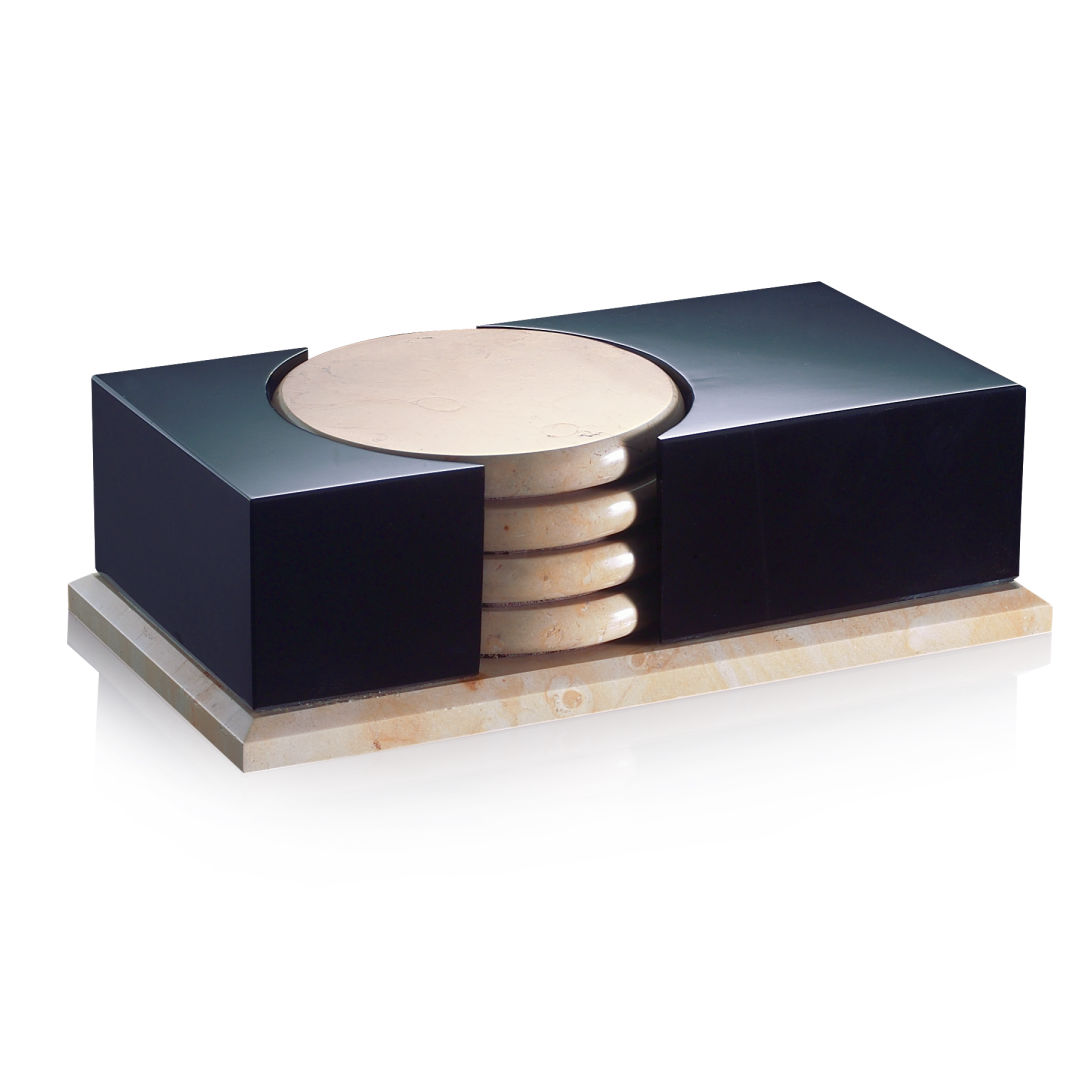 Stuning Thick Black marble Coaster Holder with Boticino Coasters Etching on each Individual Coaster Optional Colorfill included. 4.25″ W x 8.0″ H