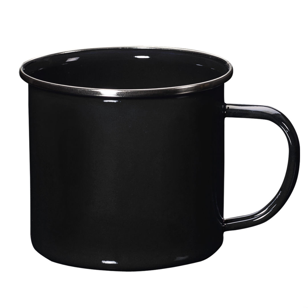 The Rockland enamel mug has a low style and vintage look, perfect for office or home. The three classic colors are complemented with a glazed black rim and extra large handle.