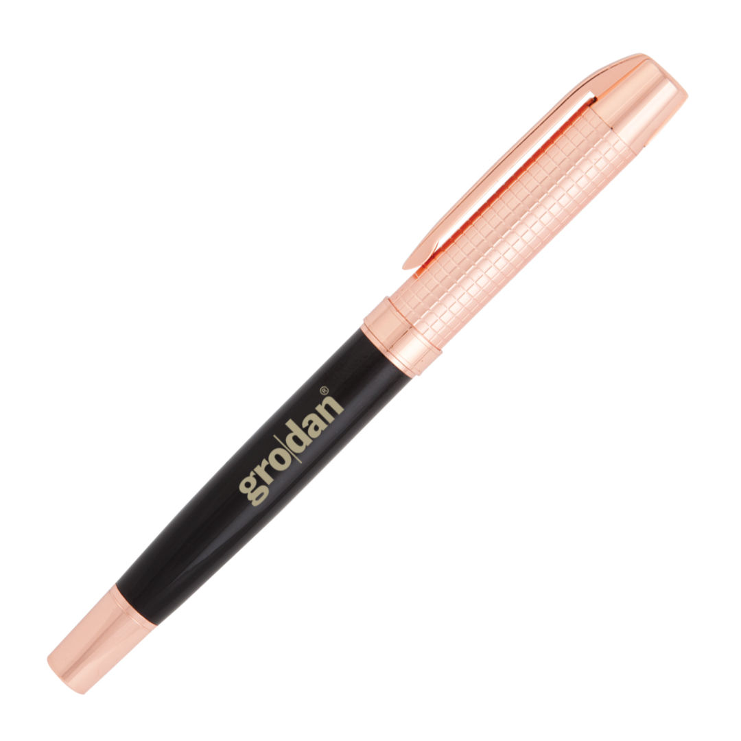 Rose Gold aluminum rollerball pen with a ribbed removable cap. Makes for an elegant executive gift or a simple token of appreciation.